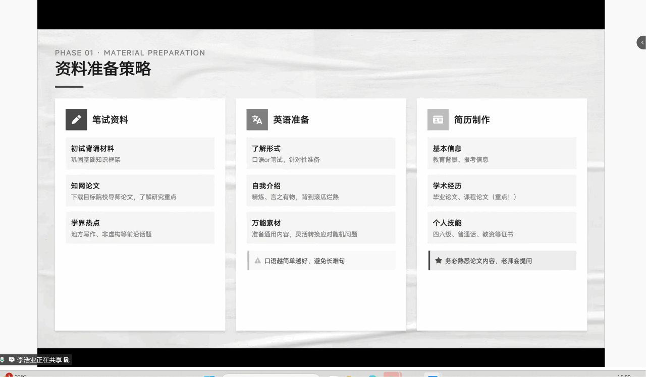 李浩业围绕专业课复习、英语口语、简历材料、面试礼仪及长远规划五个维度展开系统讲解。他建议同学们在专业课备考中回归初试基础,同时深入研读目标导师近期论文及学界热点;面试环节需展现自信与礼貌,答辩内容应紧扣个人简历。梁锋杰则聚焦信息搜集方法,提出“官方优先法”与“精准筛选法”,指导同学们高效提炼导师论文核心观点,实现科学备考。