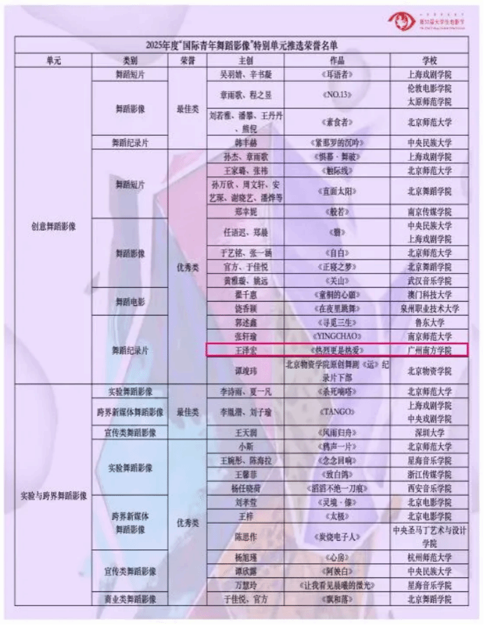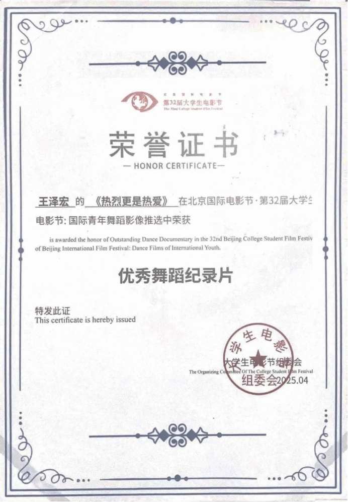 6月10日,北京国际电影节·第32届大学生电影节“原创之夜”在北京师范大学(海淀校区)顺利举办。本届大学生原创作品再创新高,共有海内外10多个国家的300多所高校参与,各单元征集作品共3000余部,其中“国际青年舞蹈影像”特别单元创作精品256部,经过多轮遴选,最终有87部优秀作品脱颖而出入围终审环节,在终审环节只有18部获得2025年度“国际青年舞蹈影像”特别单元推选荣誉名单。我院由肖洁夏老师指导的2021级网络与新媒体专业同学王泽宏的作品《是热烈更是热爱》成功入围,并获得创意舞蹈影像单元舞蹈纪录片优秀奖,项目团队受邀请参加北京师范大举行的颁奖仪式,文学与传媒学院派出胡美香教授代表团队参加领奖。