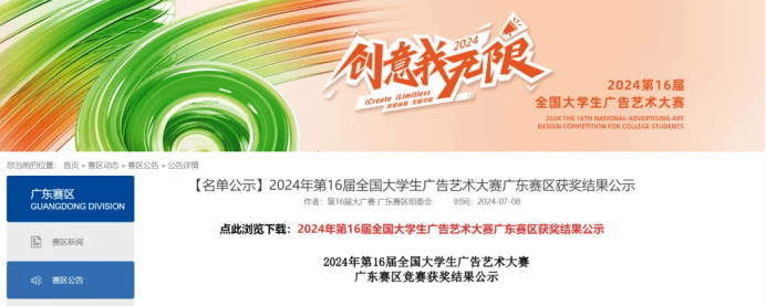 2024年第16届全国大学生广告艺术大赛广东赛区竞赛获奖结果已出。本次比赛中,文学与传媒学院学子在平面设计、视频、文案、策划、广播等多个项目中展现了出色的专业素养和创新能力,收获硕果累累,取得了耀眼的成绩!