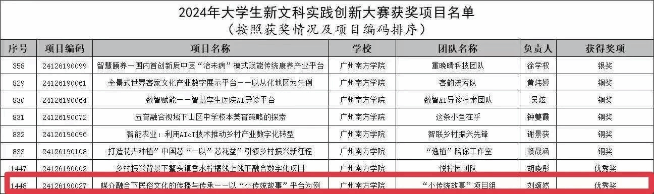 2024年大学生新文科实践创新大赛为全国性赛事,涵盖智慧康养、文化产业、数智赋能、美育融合、乡村振兴、民间文化传播等多个领域。我院22级新闻学专业学生刘颂然带领“小传统故事”项目组,以“媒介融合下民俗文化的传播与传承——以‘小传统故事’平台为例”项目参赛,最终荣获优秀奖。该项目聚焦民俗文化的创新传播,通过数字化平台助力小传统故事的传承发展,充分展现了学生在新文科背景下的创新实践能力。
