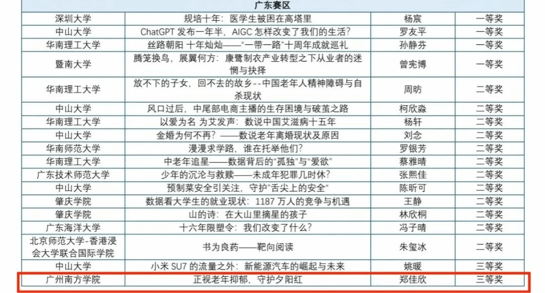 本届大赛广东赛区竞争激烈,吸引了华南理工大学、暨南大学、中山大学等众多高校参与。经专家严格评审,最终产生一等奖4项、二等奖12项、三等奖17项、优秀奖17项。我院学生团队在激烈的角逐中脱颖而出,充分展现了扎实的数据挖掘、材料分析和信息可视化能力,其作品紧扣社会热点,以严谨的数据调查和独到视角,深入探讨老年抑郁问题,体现了新闻学子对社会议题的敏锐洞察与人文关怀。