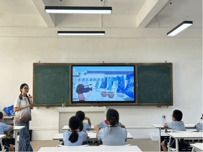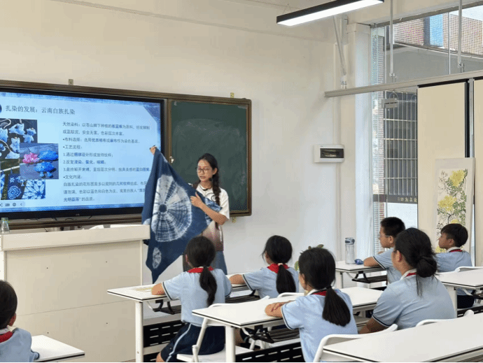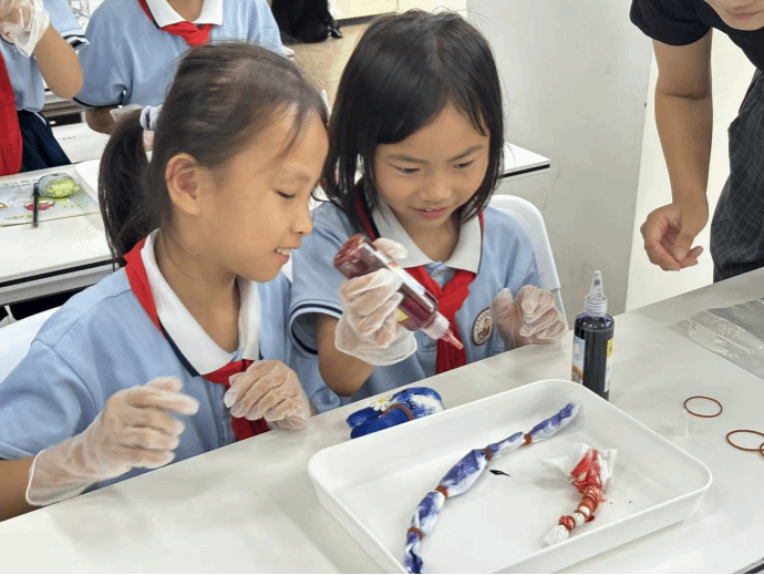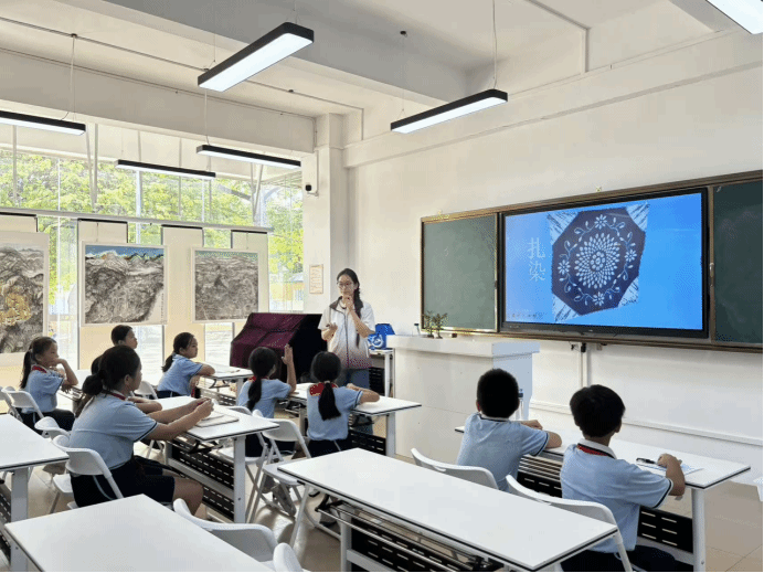 接着,小张老师通过ppt详细介绍扎染技艺的起源、发展、流派以及常见艺术品等,让同学们多方面感受扎染非遗文化的魅力。在充分了解之后,小张老师为小朋友们播放扎染实操视频,并耐心地讲解每项制作步骤。小朋友们在小张老师的指导下亲手体验扎染制作,从构想到实践,感受白布与染料在指尖碰撞,真切触摸非遗技艺的温度。过程中还穿插了互动答疑环节,小张老师一边讲解,一边耐心调整同学们的手法。完成之后,同学们还互相分享创作心得。在扎染魅力的感染下,课堂充满了欢声笑语。