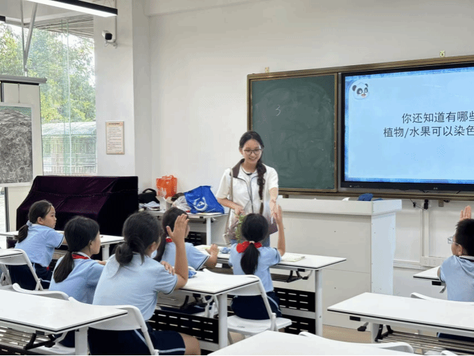 课堂伊始,小张老师抓住小朋友们的好奇心,巧妙地利用卡通熊猫小记者达达的视角,带他们走进不一样的扎染世界。小张老师向学生们提问:“你知道扎染有哪些代表吗?”学生们热情高涨,争先恐后地回答小张老师的问题。他们的热情无疑是对扎染文化最好的认可。每位积极答题的同学都收获一份扎染挂件,小张老师以文创为媒,让非遗的种子悄然在孩子们心中扎根。
