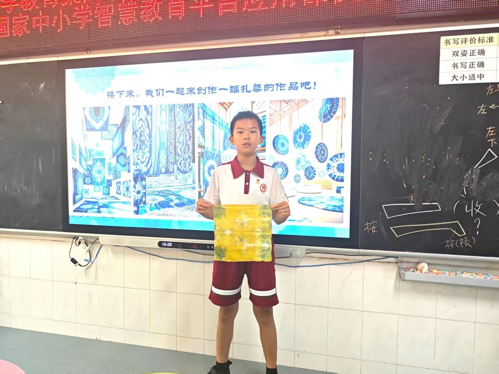 小李老师通过展示许多美轮美奂的扎染作品吸引了小朋友们的注意力,并通过讲解扎染的相关知识,带领同学们逐渐进入扎染的世界。“正因为扎染艺术具有独特之处,能创造出丰富多样的扎染纹样,才使得每件扎染作品都独一无二。” 小李老师耐心详细地为同学们讲解,让同学们充分感受到扎染技艺的独特魅力,让孩子们在好奇中慢慢摸清了扎染的 “小秘密”。