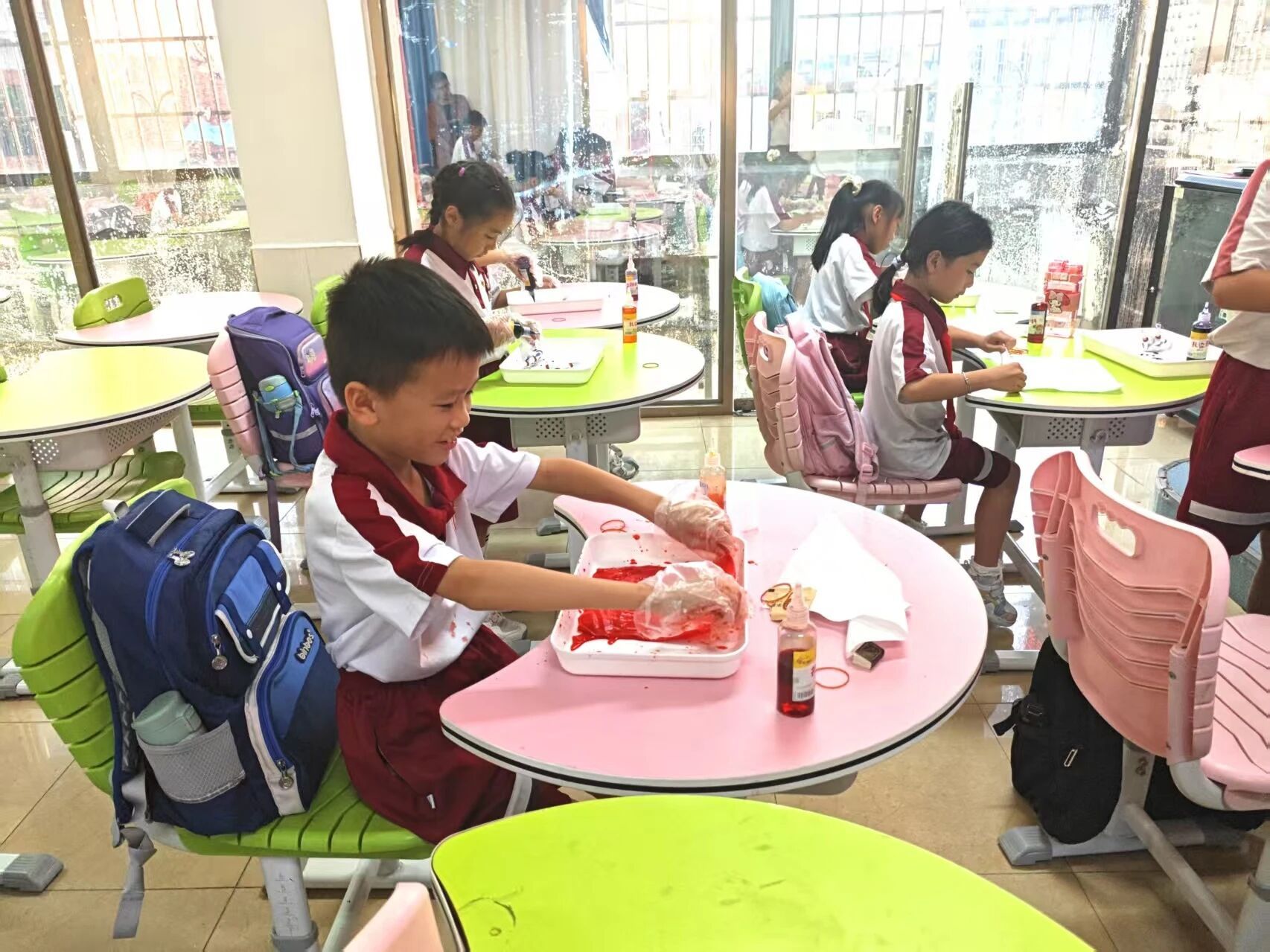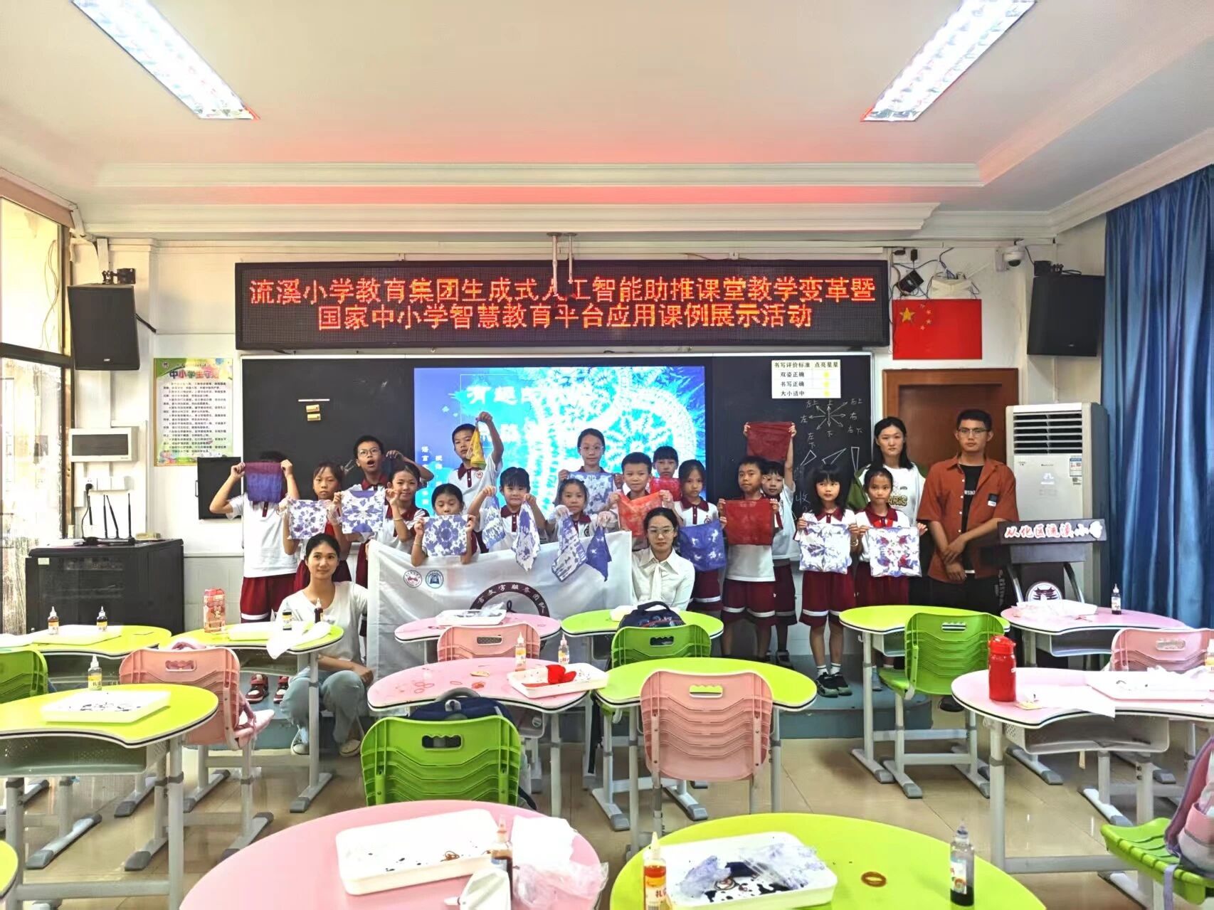 阳光透过玻璃窗,落在五颜六色的扎染布上,也落在孩子们笑盈盈的脸上。这些带着童真、充满温度的作品,或许没有专业扎染作品的精致,却承载着孩子们最纯粹的创意与快乐。