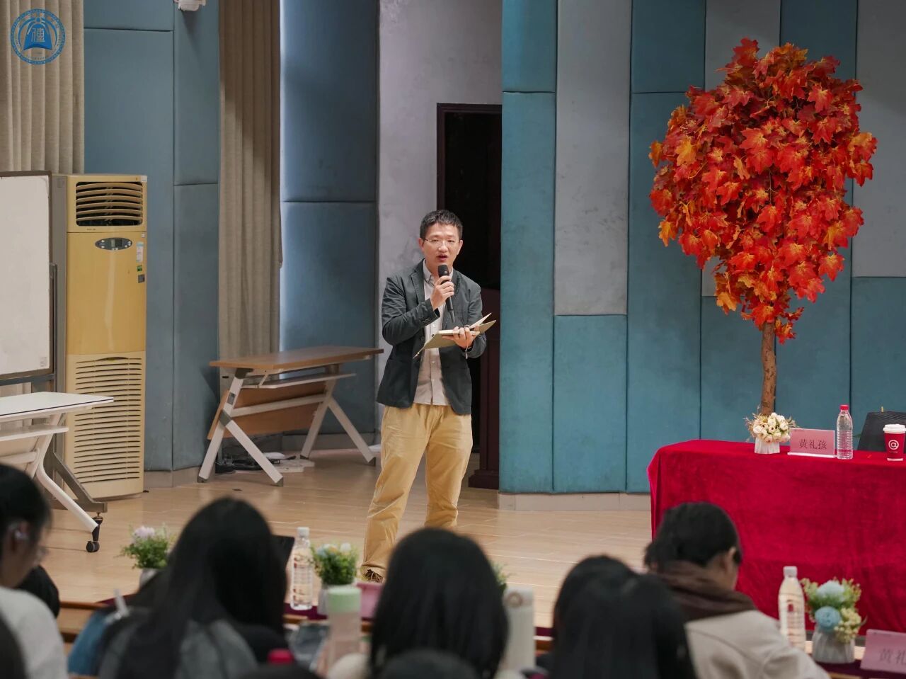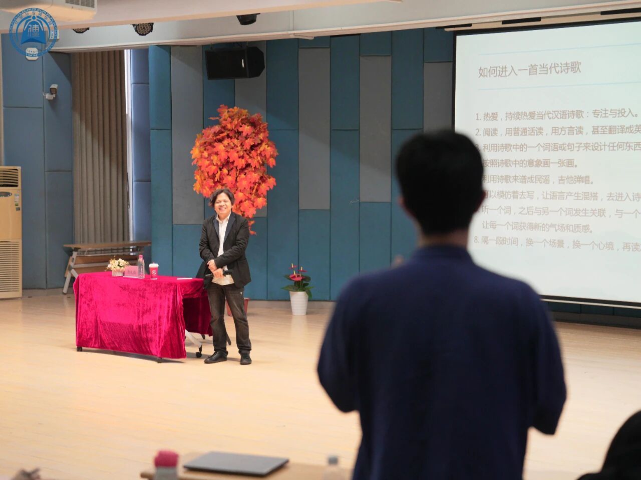 讲座尾声,中国语言文学系主任唐可副教授作总结发言。他谈到,本次讲座让在座师生对黄礼孩先生的诗歌与人格有了更感性的理解。唐可副教授以“赤子”“干净”与“愚人”三个关键词,精炼概括了黄礼孩的诗歌精神,并指出,人应构建属于自己的“精神王国”,生命因此更具意义。他强调,世界存在某种隐秘的联结,而诗歌正是发现这种联结的路径,值得每个人亲身追寻。