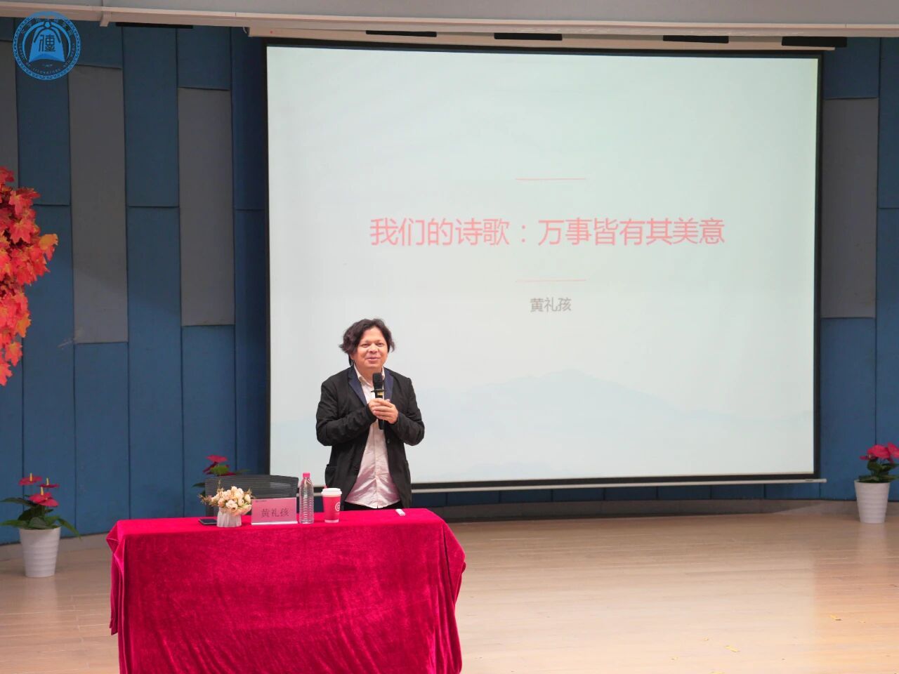 2025年10月22日下午,博学大讲堂2025年第5期(总第105期)在我校顺利举行。本次活动以“我们的诗歌:万事皆有其美意”为主题,特邀一级作家、诗人、艺术策展人黄礼孩老师担任主讲嘉宾。文学与传媒学院院长孙立教授、中国语言文学系主任唐可副教授,中国语言文学系苟志和老师、刘涵玉老师、杨南岳老师,网络与新媒体系黄华怡老师,行政办公室主任潘静老师以及辅导员许洋洋老师出席讲座。