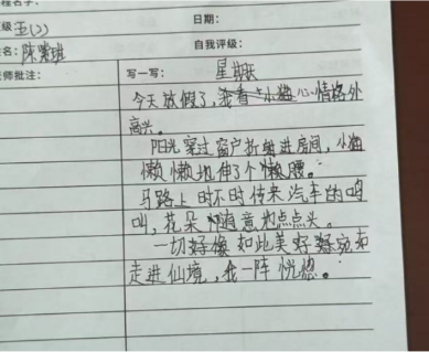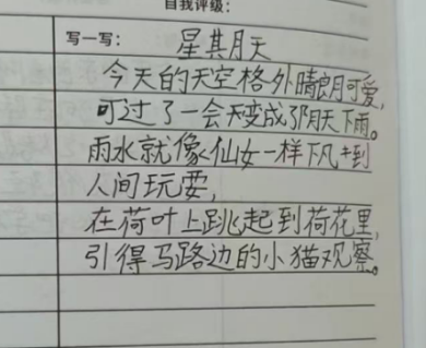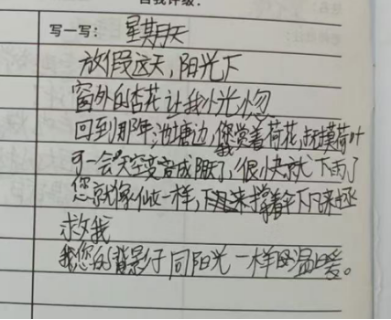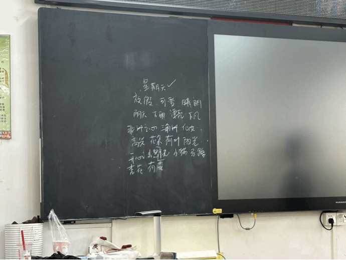 创作环节中,海棠老师以“星期天”为主题,并邀请大家联想与其相关的词。课堂氛围再次升温,孩子们凝神思索,说出的词有“荷花”“杏花”等眼睛能看到的具体名词,也有“仙女”“三角洲”等奇思妙想的词,还有“阳光”“漂亮”等描述心情的形容词。