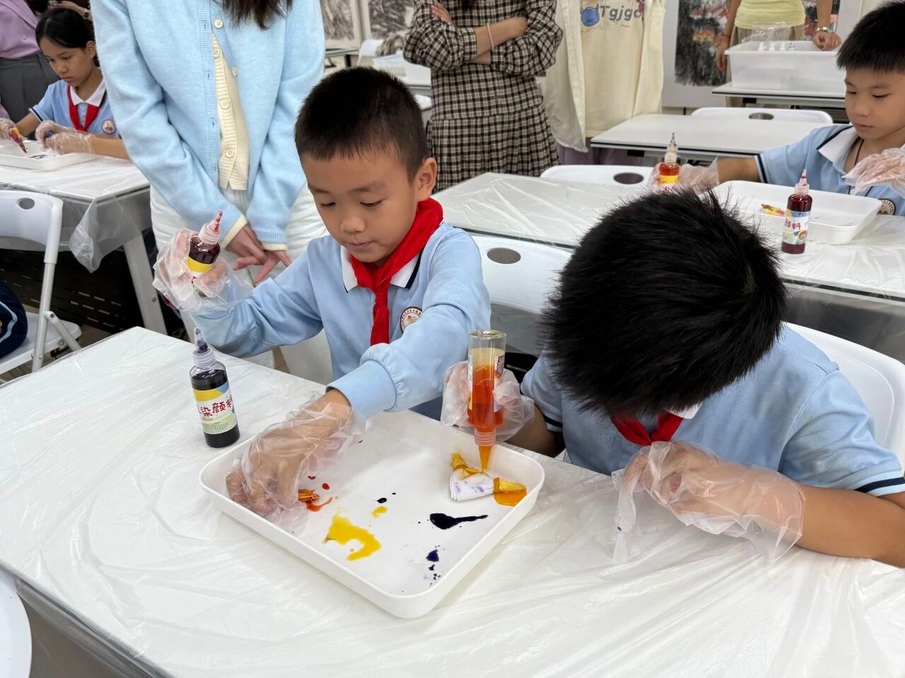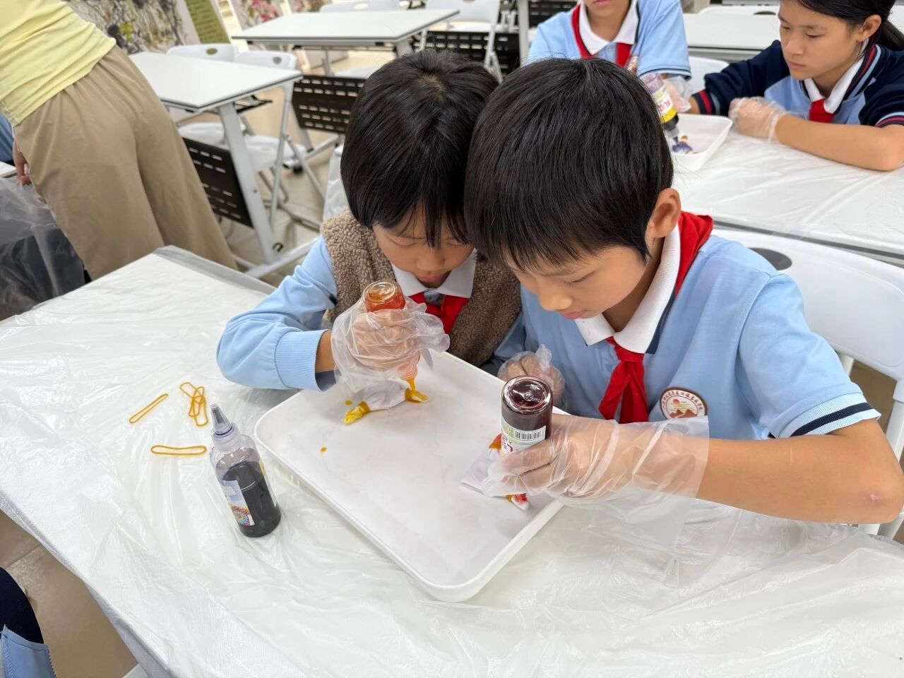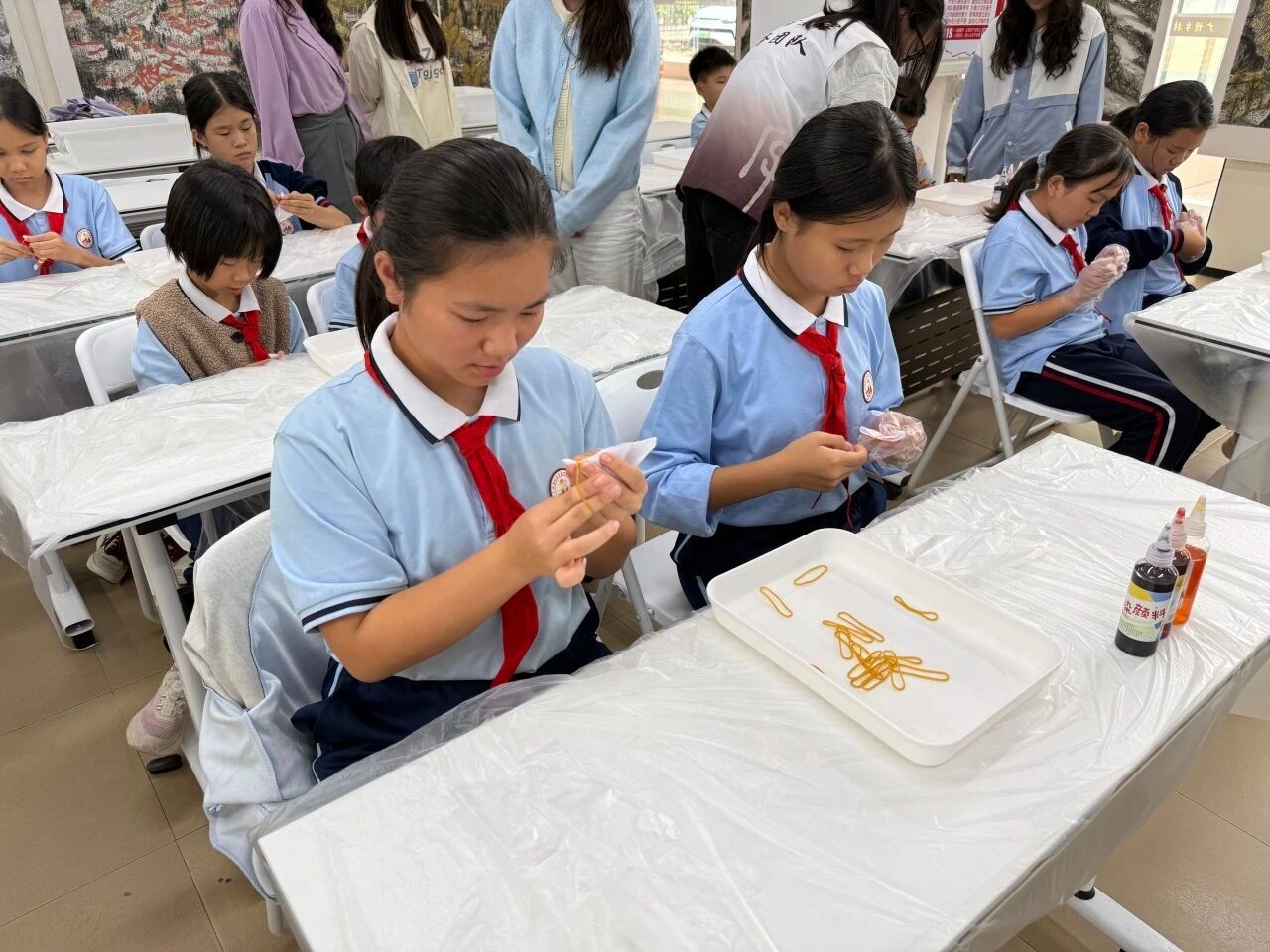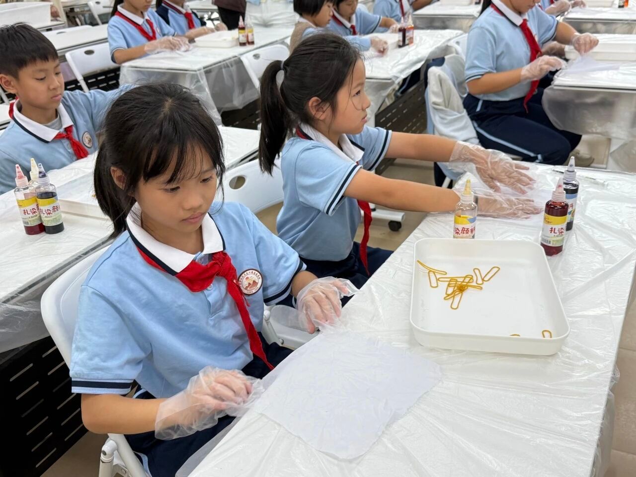 2025年10月28日,文学与传媒学院语言文字服务团队在游婉雯老师的带领下,走进善施小学,开展了一场别开生面的扎染多色染法体验课程。