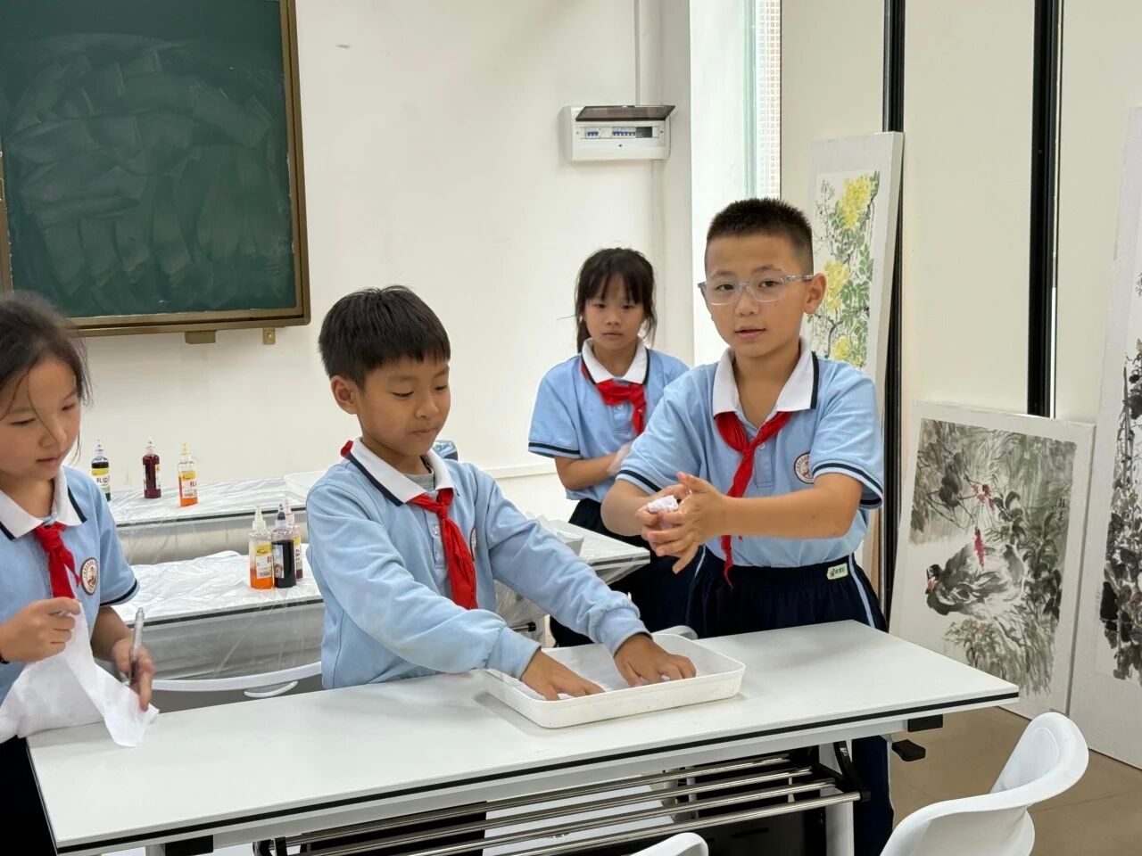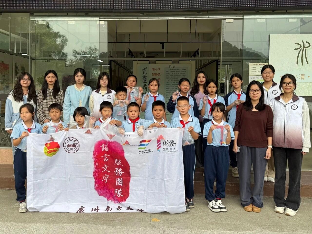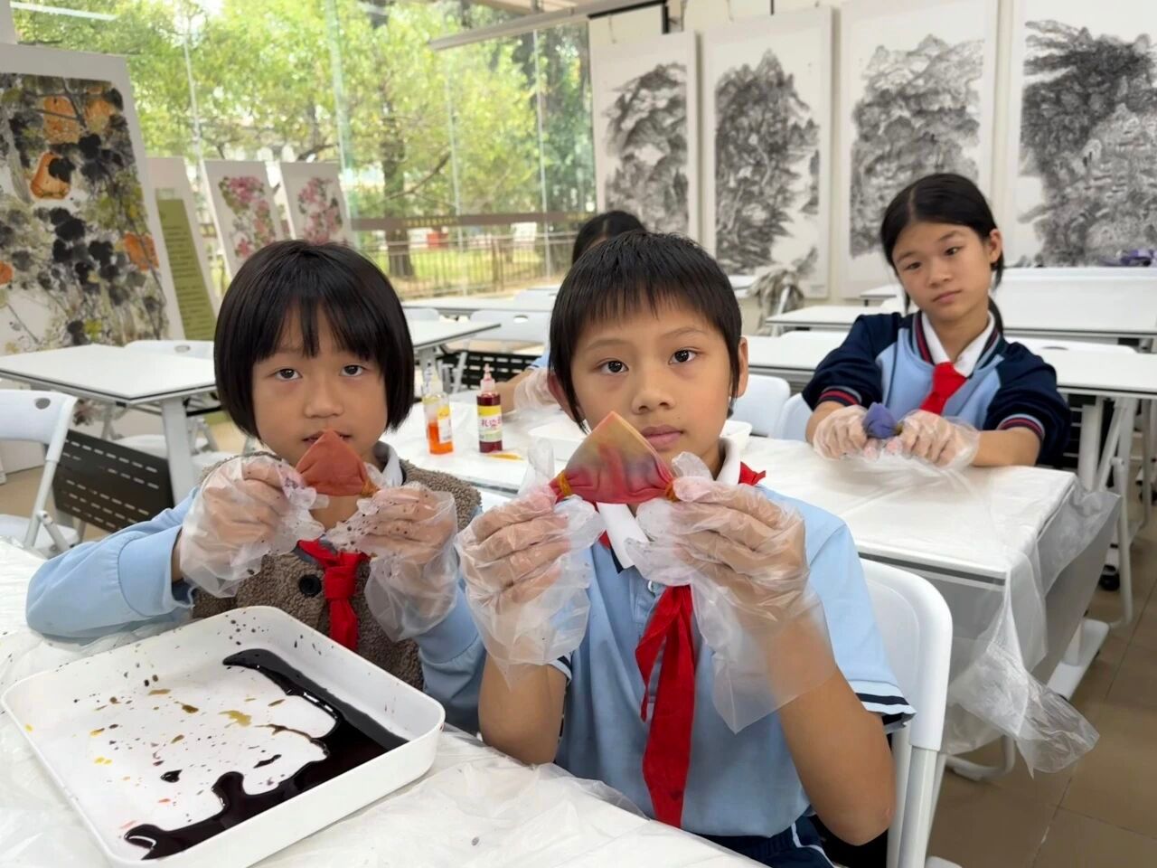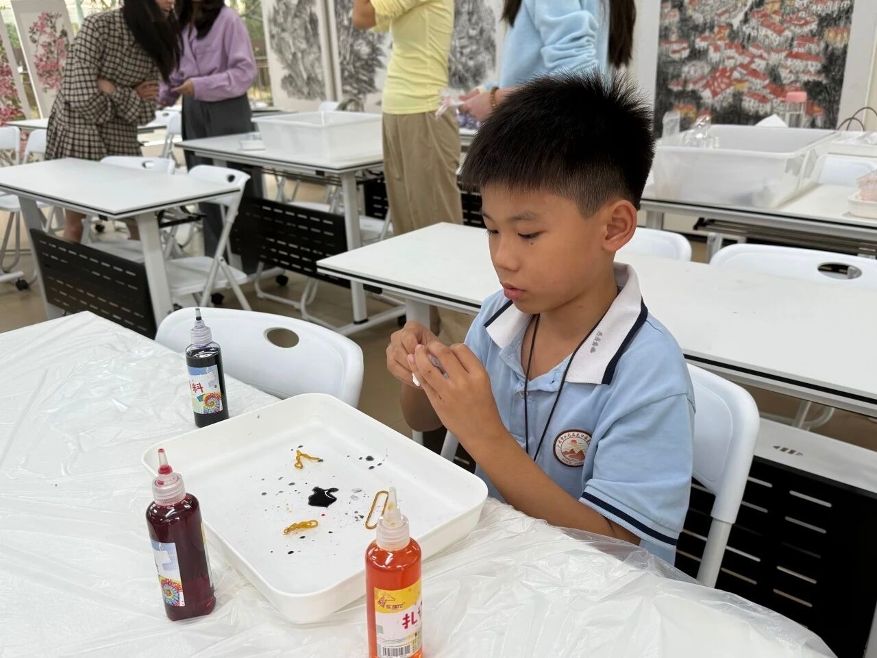 2025年10月28日,文学与传媒学院语言文字服务团队在游婉雯老师的带领下,走进善施小学,开展了一场别开生面的扎染多色染法体验课程。