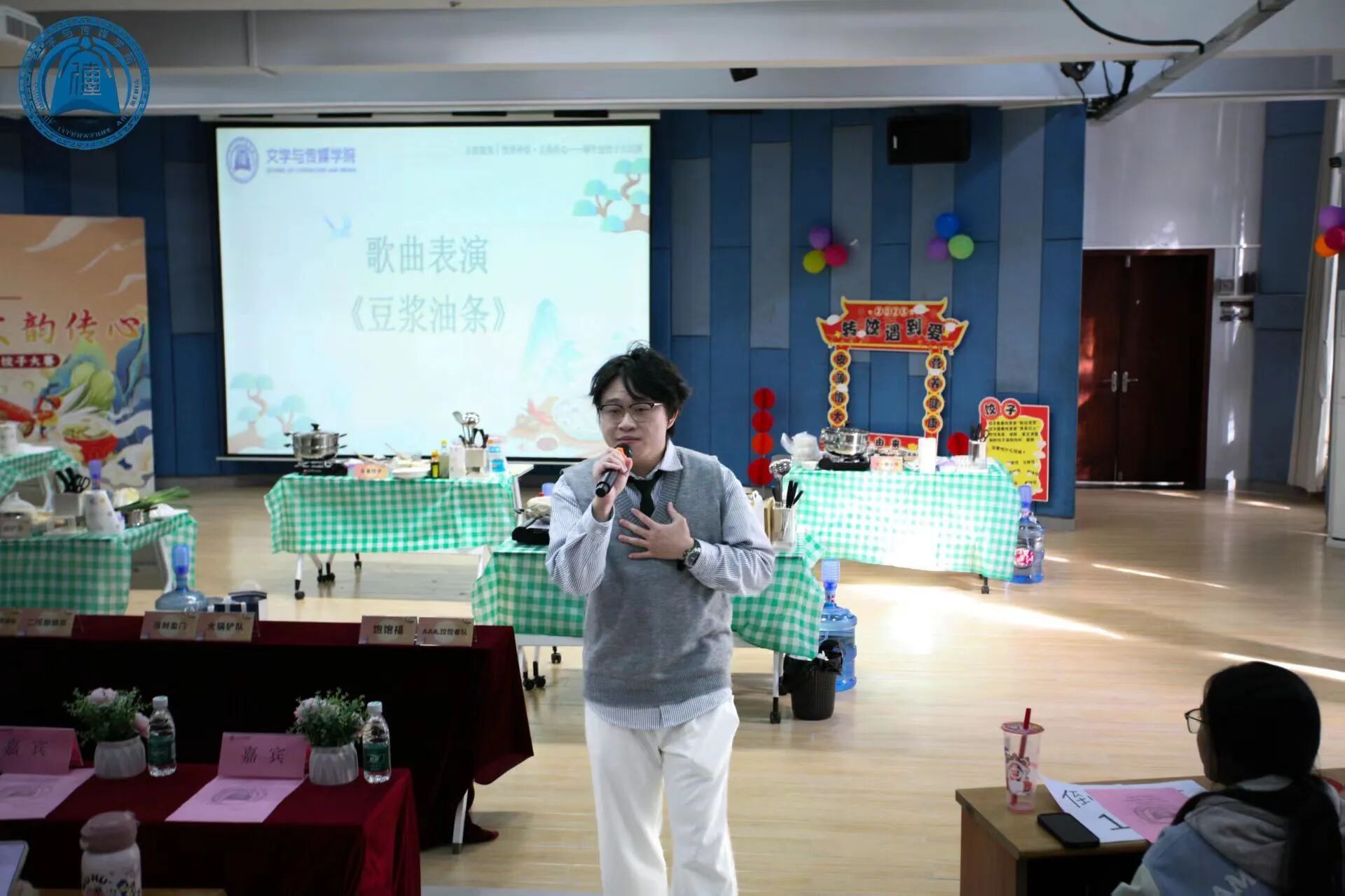 接着,文学与传媒学院魅声歌唱队的温嘉耀同学为在场的师生带来了一首暖场歌曲——《豆浆油条》,悠扬的旋律、真挚的演唱瞬间点燃全场的气氛,为即将开始的比拼注入了满满的热情和期待。