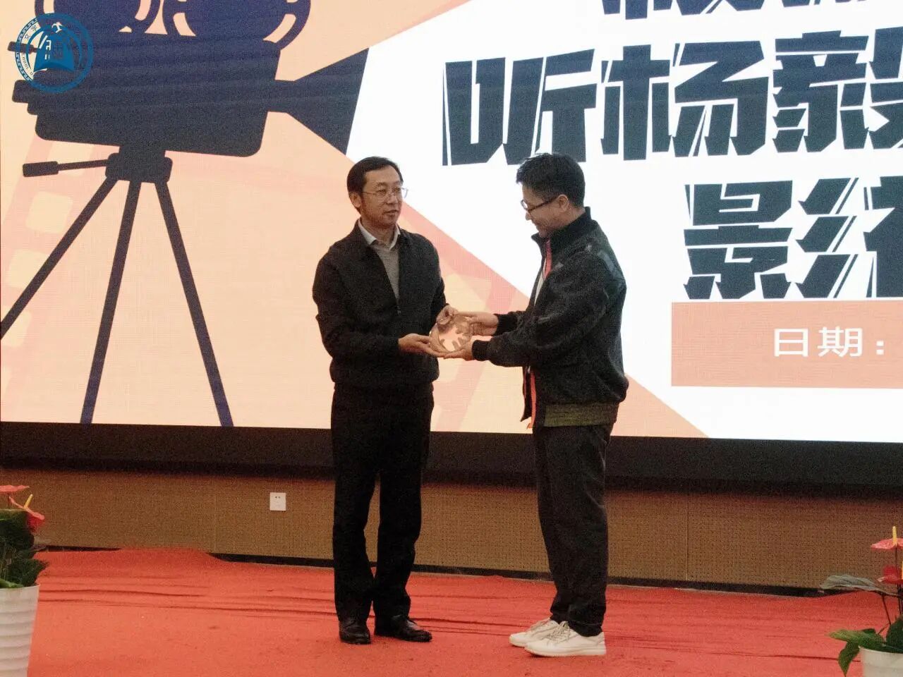 校长助理蒋玮老师为杨毅坤导演颁发“终身荣誉导师”聘书,并代表学校校友会赠送礼品