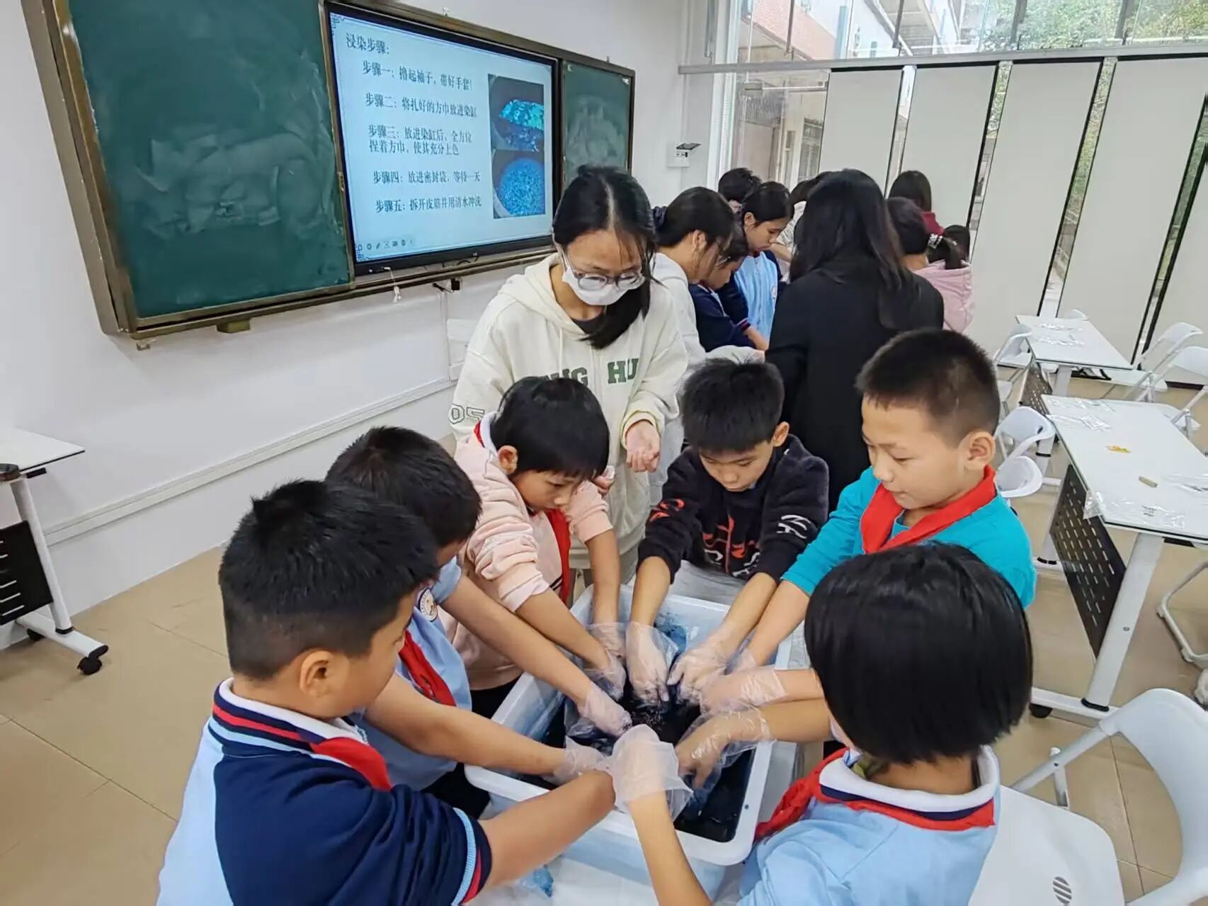 过程中,学生们在小卢老师和小助手的协助下,细心地调整扎结的松紧度,精心制造出独特的图案纹理。随后,大家将扎制好的手帕放入蓝靛染液中泡染,看着素白的布料逐渐晕出浅蓝色、黄绿色、藏青色,不少学生认真地记录上色时间,使其充分上色。待手帕捞出密封,虽无法立刻解开,但也能看出手帕上独特的蓝白肌理。学生们拿着自己的作品,笑脸盈盈,课堂充满了对技艺的骄傲与传承的向往。