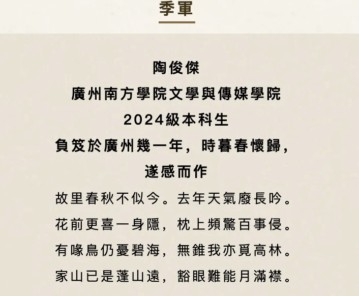 在本次大赛中,文学与传媒学院2024级本科生陶俊杰同学以其深厚的古典文学素养与真挚动人的诗情,历经多轮严格评审,最终荣获“大学生诗组季军”,展现了我院学子在传统诗词创作方面的不俗实力与蓬勃朝气。