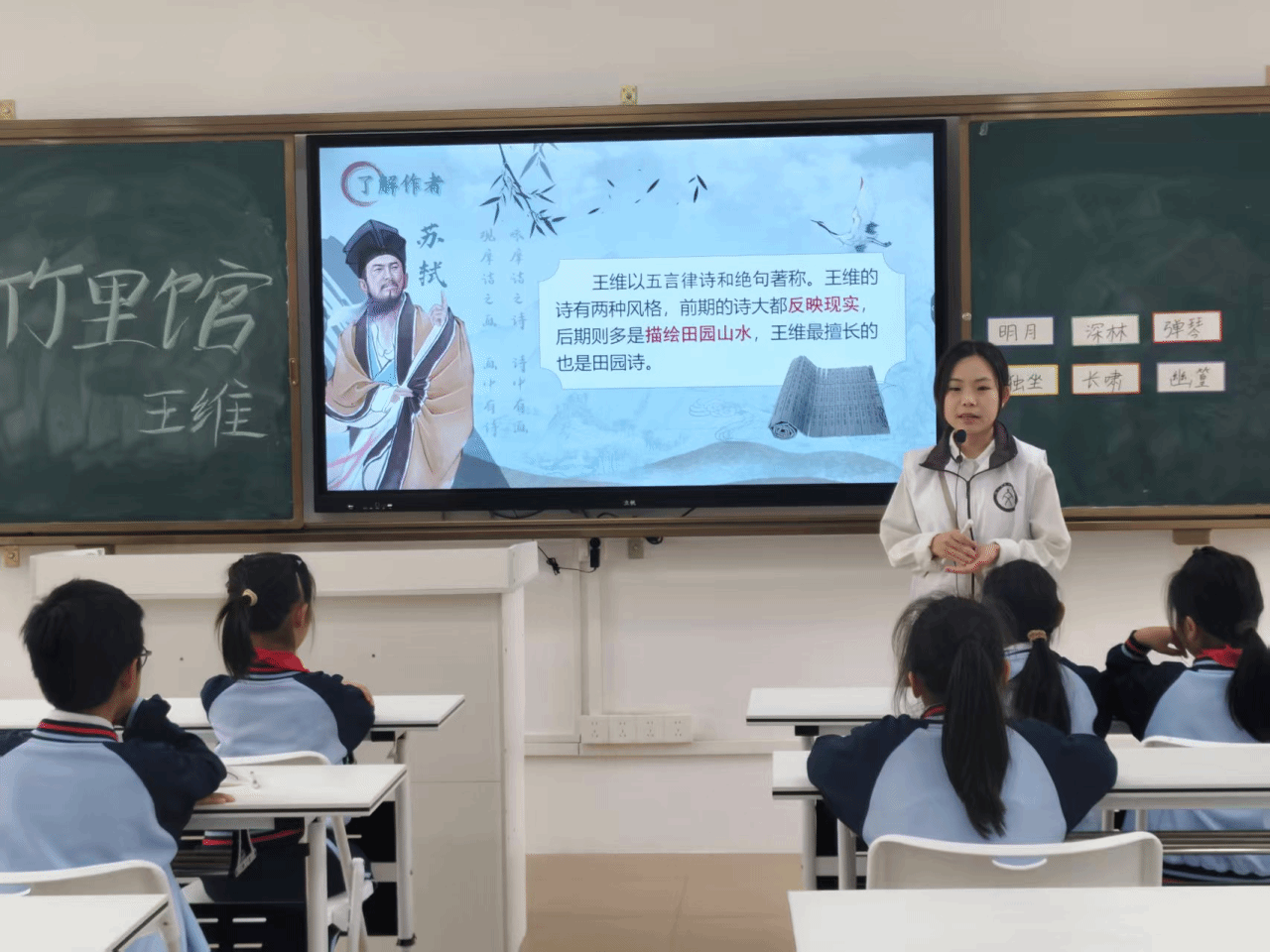 2025年11月13日下午,语言文字服务团队的成员们在指导老师杜欣莉老师的带领下,走进从化区善施学校。混入竹香的古诗词课堂准备就绪,小朋友们走进课室,也走进了“竹里馆”。