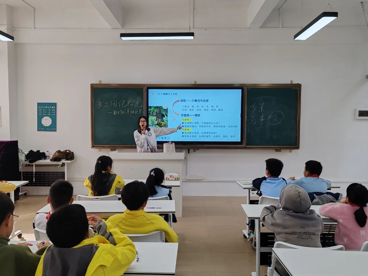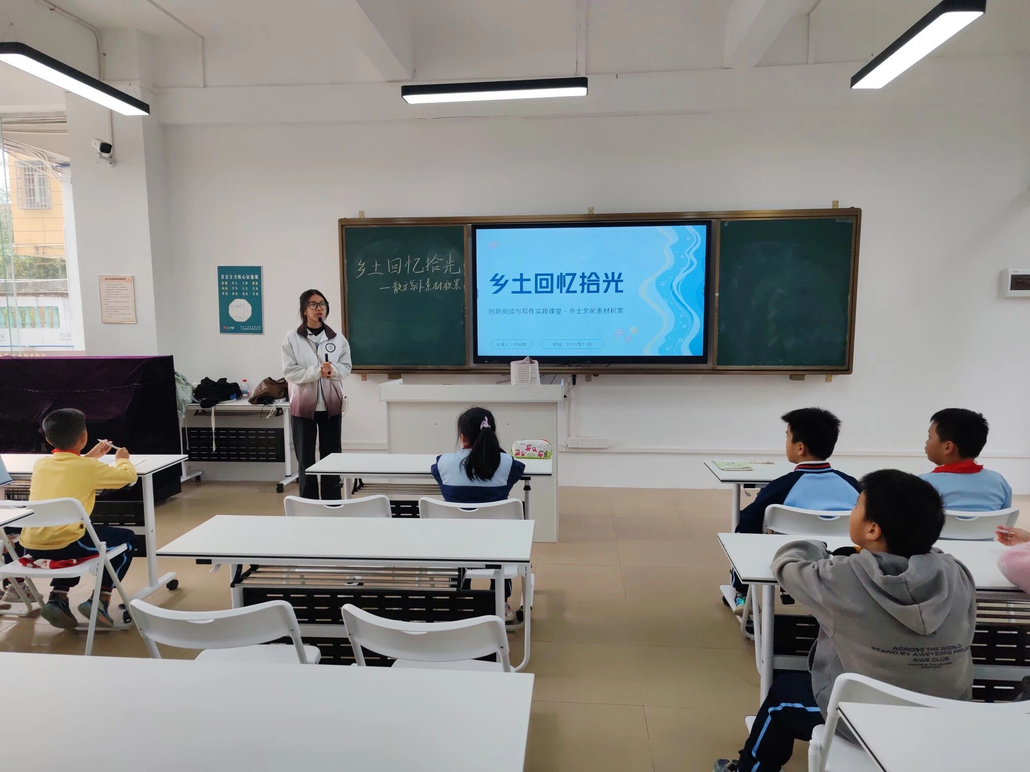 “冬意悄然,岁月轻慢。”2025年11月19日下午,广州南方学院创意写作中心及语言文字服务团队的同学们,在钟依琼老师的带领下,一同走进善施学校,参与2024级汉语言文学4班卢湘敏小老师的“从化乡土生活”课堂。“乡土”,一个耳濡目染的词,它可以是孩童们的春节烟火气,也可以是小卢老师眼中的一缕炊烟,还可以是我们记忆中的点点滴滴。本次,小卢老师将巧用六根法,带领小同学们走进记忆中的乡土,积累散文写作素材。