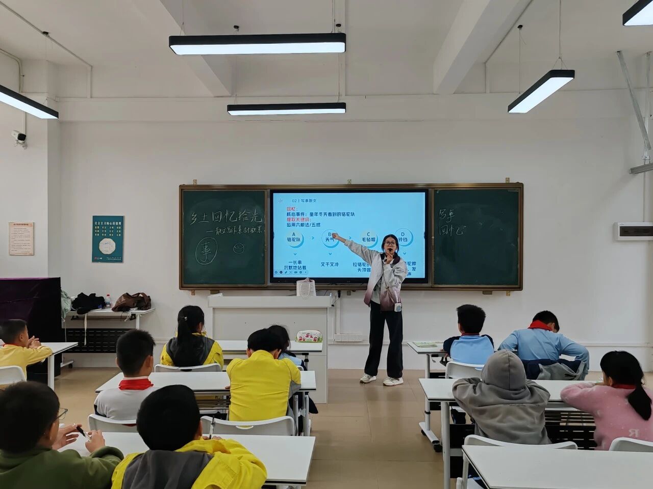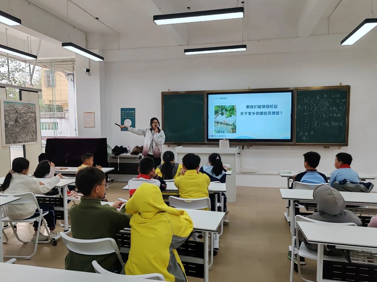 随后,小卢老师进一步分析散文构成。引入了许许多多的散文片段作为例子。如林海音女士的《冬日·童年·骆驼队》和老舍先生的《济南的冬天》。她不仅能带领小同学们提取“关键词”,还能从关键词中分析出文字的用意。然后,她循序渐进地提出了今天的重点——散文的核心是写事或者写景。