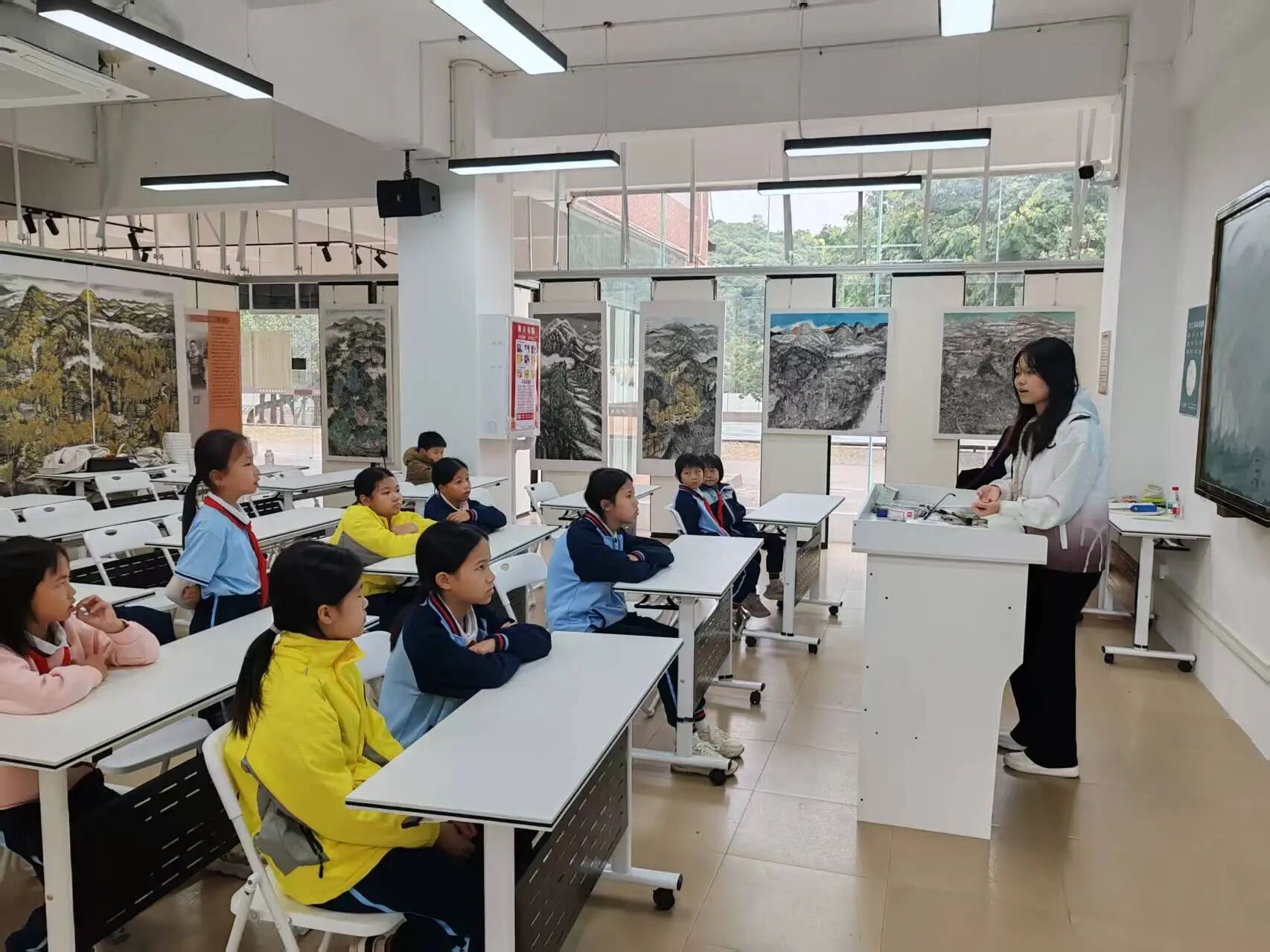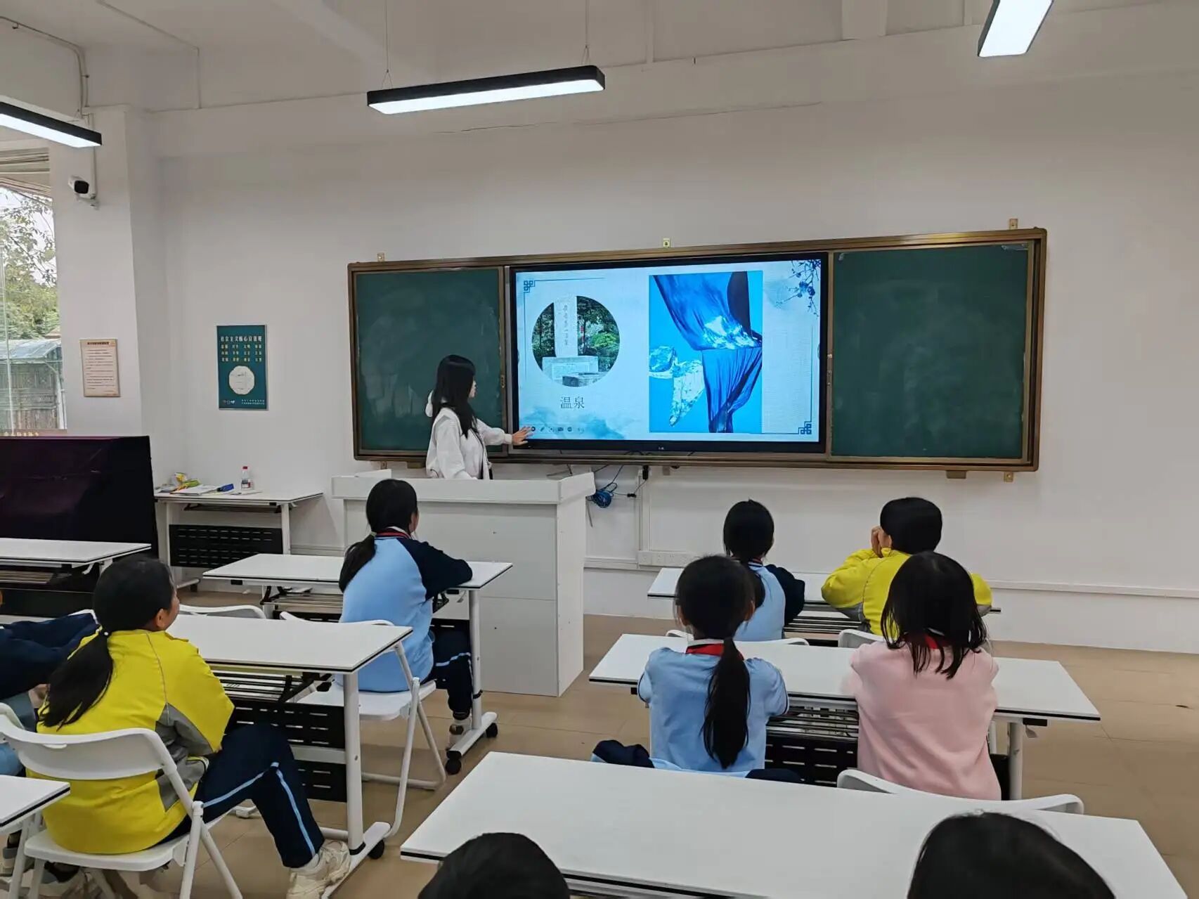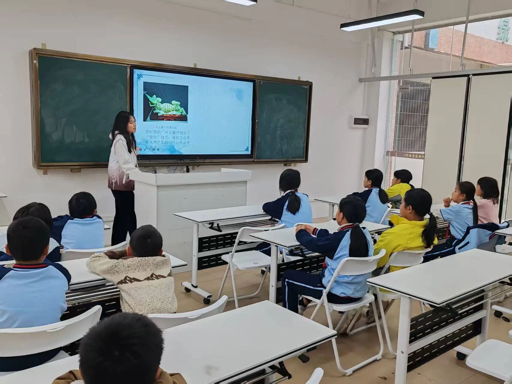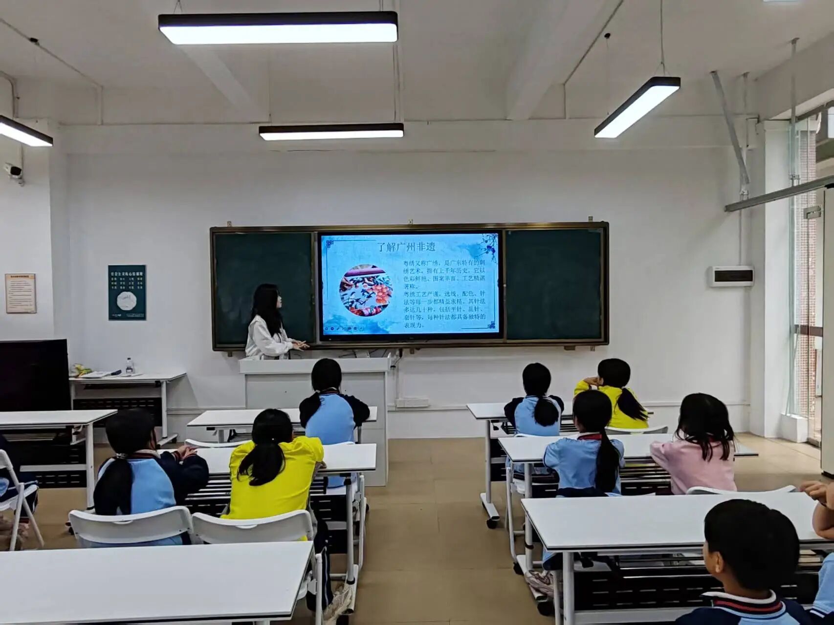 这次课堂,不仅是扎染作品的展示,还融入了本地的文化。在“从化扎染创意”的环节中,小朋友们陆续回答了荔枝、温泉、龙眼、流溪河等从化特产,在小庄老师的引领下,与扎染融合起来。有小朋友说:“可以通过喷染,用布盖上荔枝,再染出关于荔枝的独特图案”小庄老师欣然点头,并播放视频,使小朋友们了解荔枝作为染料的妙用。接下来,小庄老师缓缓解说从化与扎染的联系,带领小朋友们将流溪河、温泉的意象融入扎染创作中,小朋友们坐直了身体,听得特别认真。随后小庄老师又带着小朋友们解锁了广州非遗文化的独特魅力,色彩鲜艳、技艺精湛的粤绣,威风凛凛的广州醒狮,巧夺天工的广州玉雕,都令小朋友们惊叹不已,非遗文化的灵动与厚重,就这样悄悄走进小朋友们的心里。
