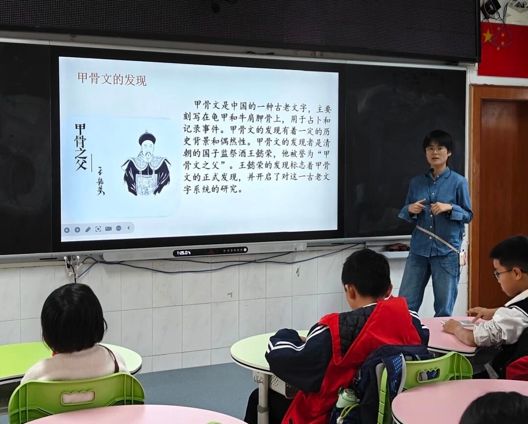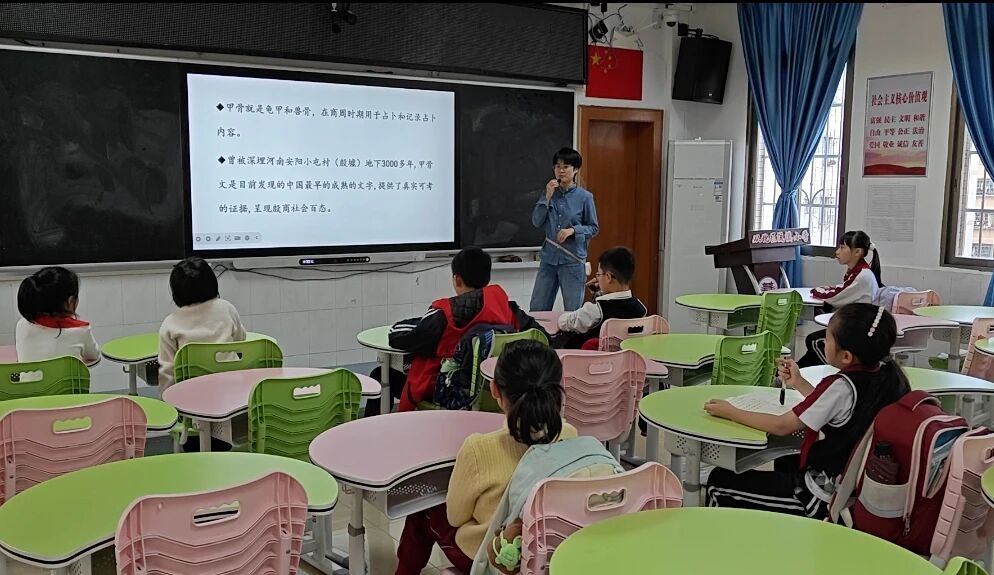 “在甲骨文的裂痕中,聆听文明破土的声响。”11月21日,广州南方学院语言文字服务团队的成员们在崔静娜老师的带领下,走进流溪小学,展开了一场探寻甲骨文奥秘的旅程。
