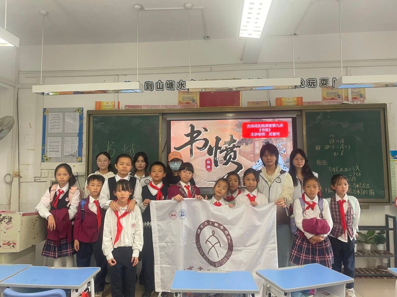 秋意渐浓,诗意正浓。2025年11月24日下午,语言文字服务团队的成员们在指导老师寇梦鸥老师的带领下,走进从化区流溪小学,开展了一场以陆游《书愤》为主题的古诗词系列课堂。本次课程由2023级汉语言文学专业武誉坷同学担任小老师,带领同学们穿越千年,感受南宋诗人陆游那沉郁顿挫的家国情怀。