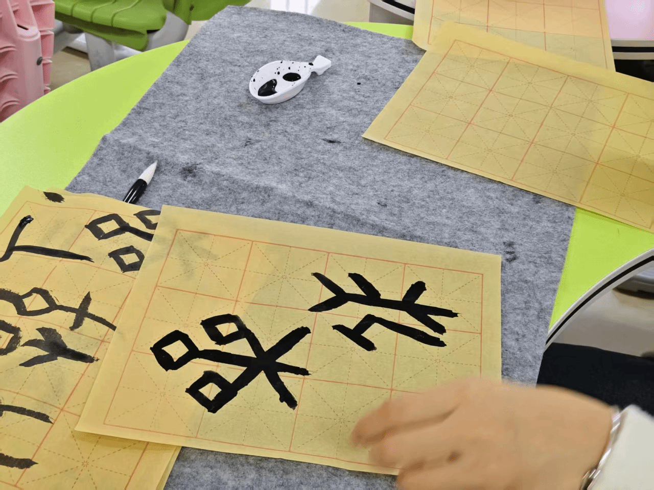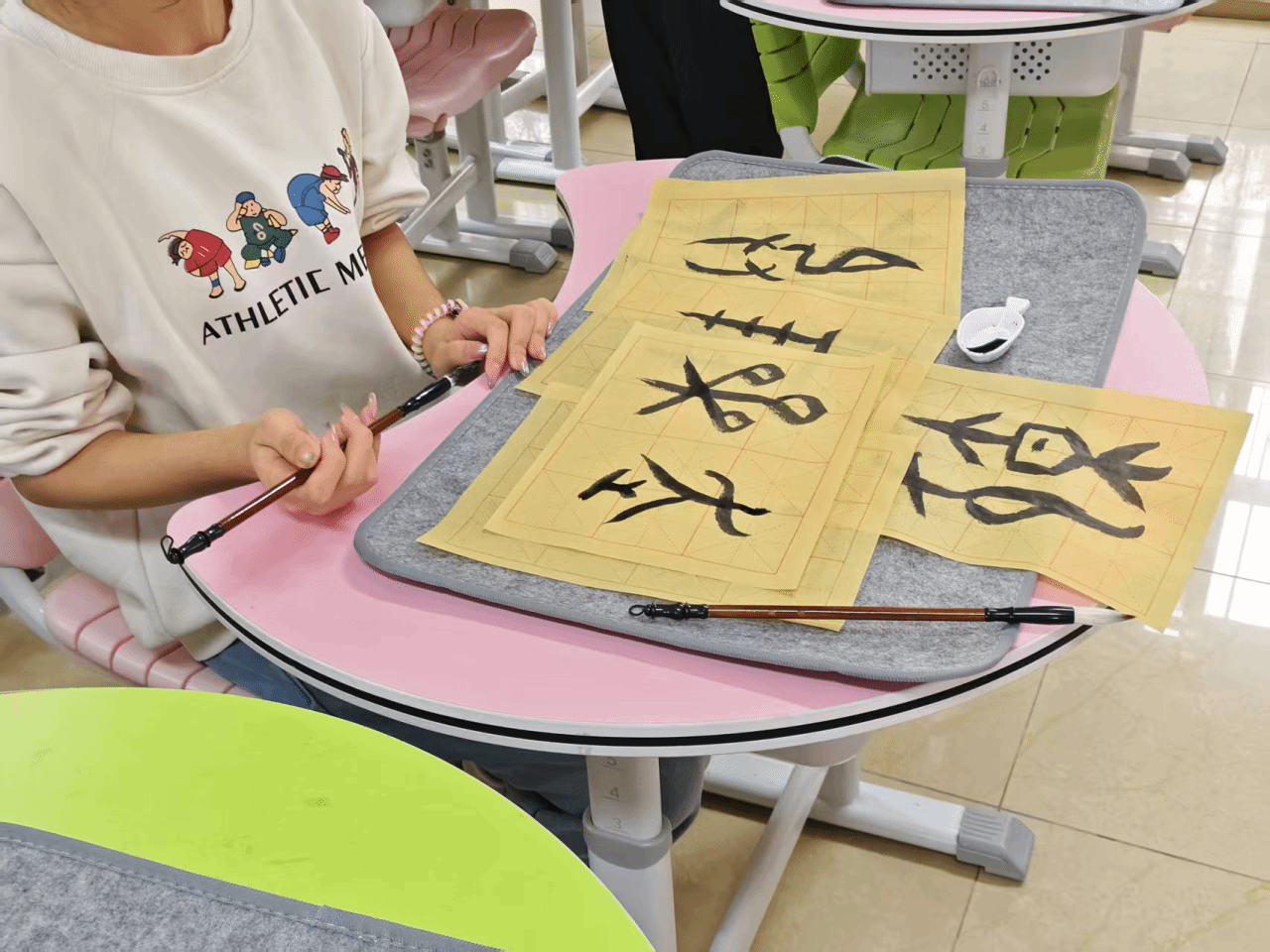 课堂尾声,同学们高举自己的创作成果,在镜头前留下珍贵合影。黄色的练习纸、白色的创作作品,承载着满满的收获与喜悦。此次甲骨文小课堂跳出传统教学模式,以“趣味猜字+笔法教学+字形临摹+创意创作”的多元形式,让同学们在动手实践中领略甲骨文的独特魅力。不仅掌握了毛笔书写的基础技巧,更读懂了汉字背后的文化密码,让千年甲骨文在新时代焕发出新的生机与活力。