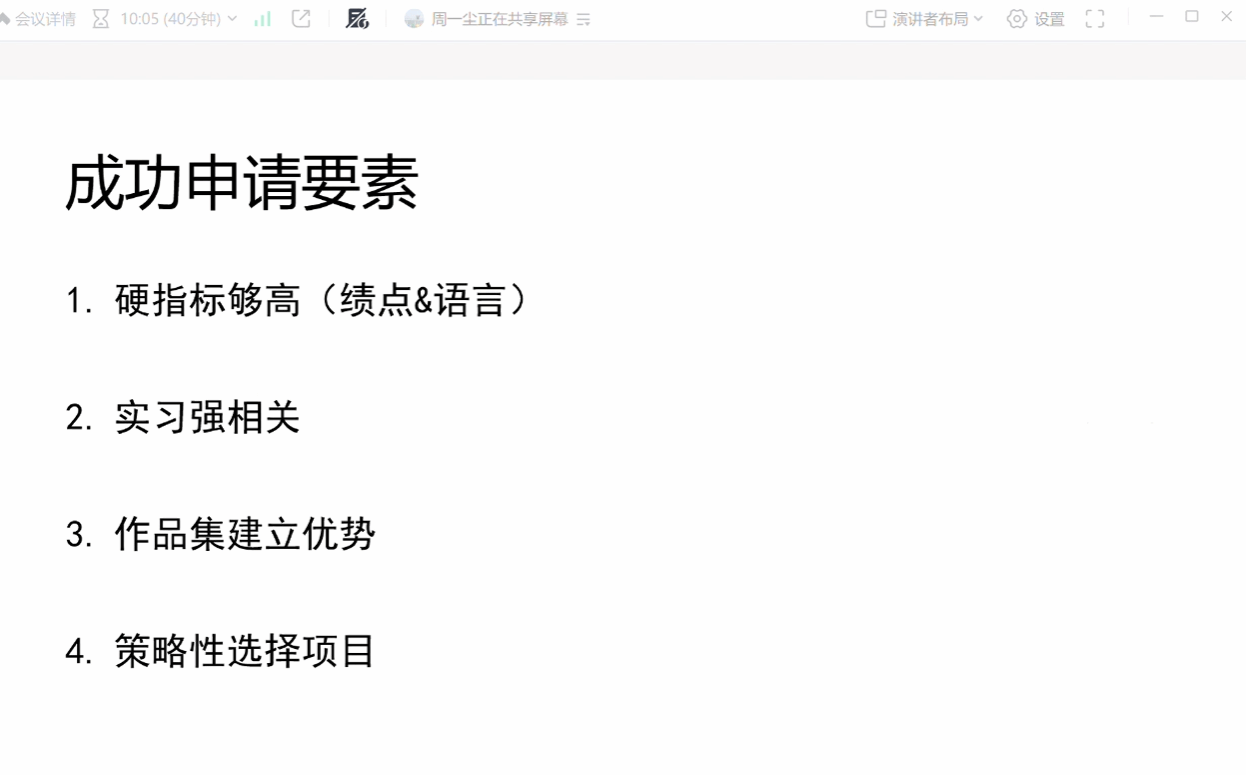周一尘同学分享了境外名校申请的经验,强调了雅思口语针对性训练及深度实习经历的重要性。