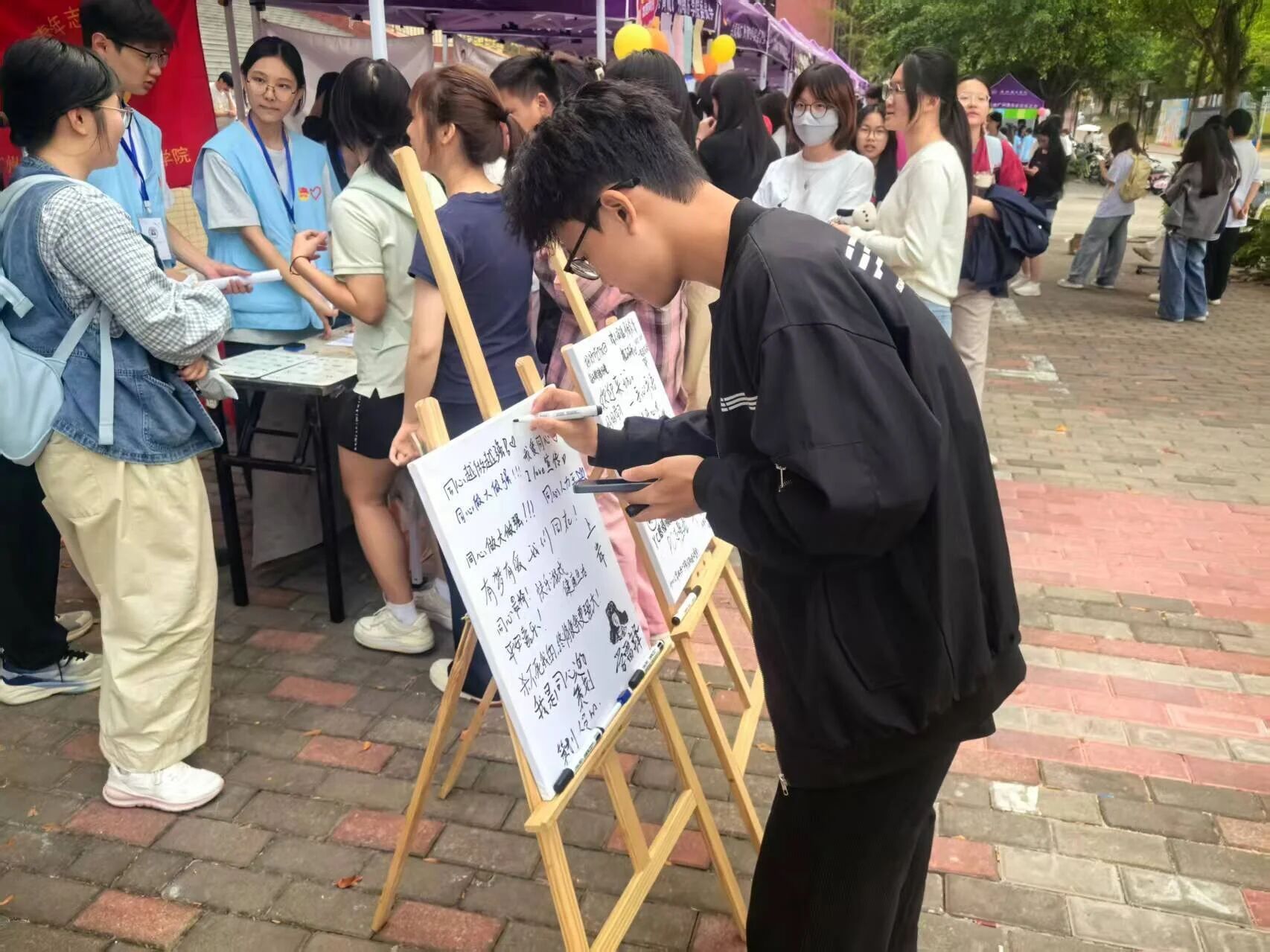 在互动区,同学们纷纷拿起笔,认真写下祝福与期许,一字一句都饱含着满满的心意和滚烫的真诚。大家将心意落笔纸上,让温暖在纸间传递,让善意在笔尖流淌。这些简单朴实的文字,没有华丽的辞藻,却藏着最动人的温度,同学们以微小却坚定的行动传承着雷锋精神,把奉献、友善与担当写进当下,也让这份温暖与力量长久留在每个人心间。