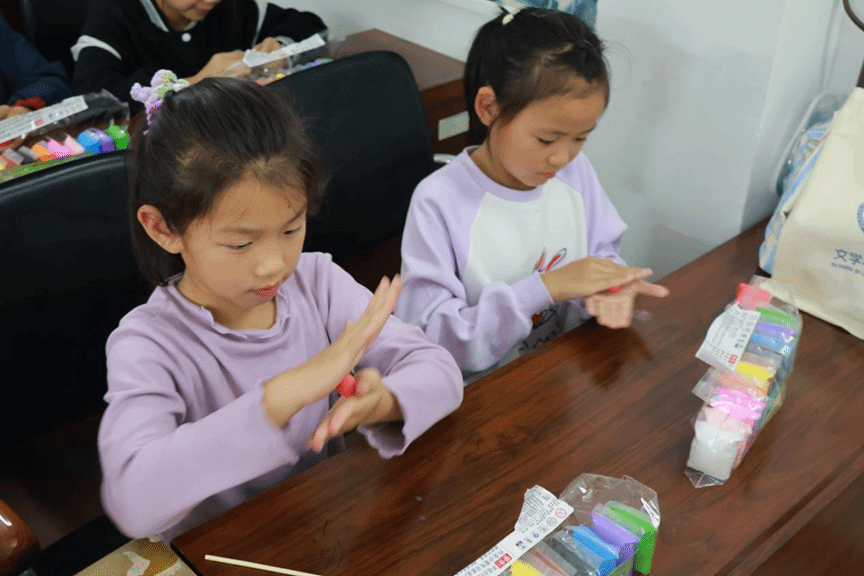 随后的面塑手工体验环节,是孩子们最期待的时刻。志愿者们分组指导,为孩子们分发超轻粘土、竹签、垫板等材料,手把手教学揉、搓、捏、压等面塑基础手法。从经典的小雷锋帽,到憨态可掬的熊猫、兔子,志愿者耐心示范,孩子们认真模仿,指尖翻飞间,一块块普通的粘土变成了各式各样的可爱造型。志愿者们全程陪同,提醒孩子们注意安全、保持整洁,让每个孩子都能完成属于自己的面塑作品,在动手实践中感受传统非遗的匠心之美,体会创作的快乐。