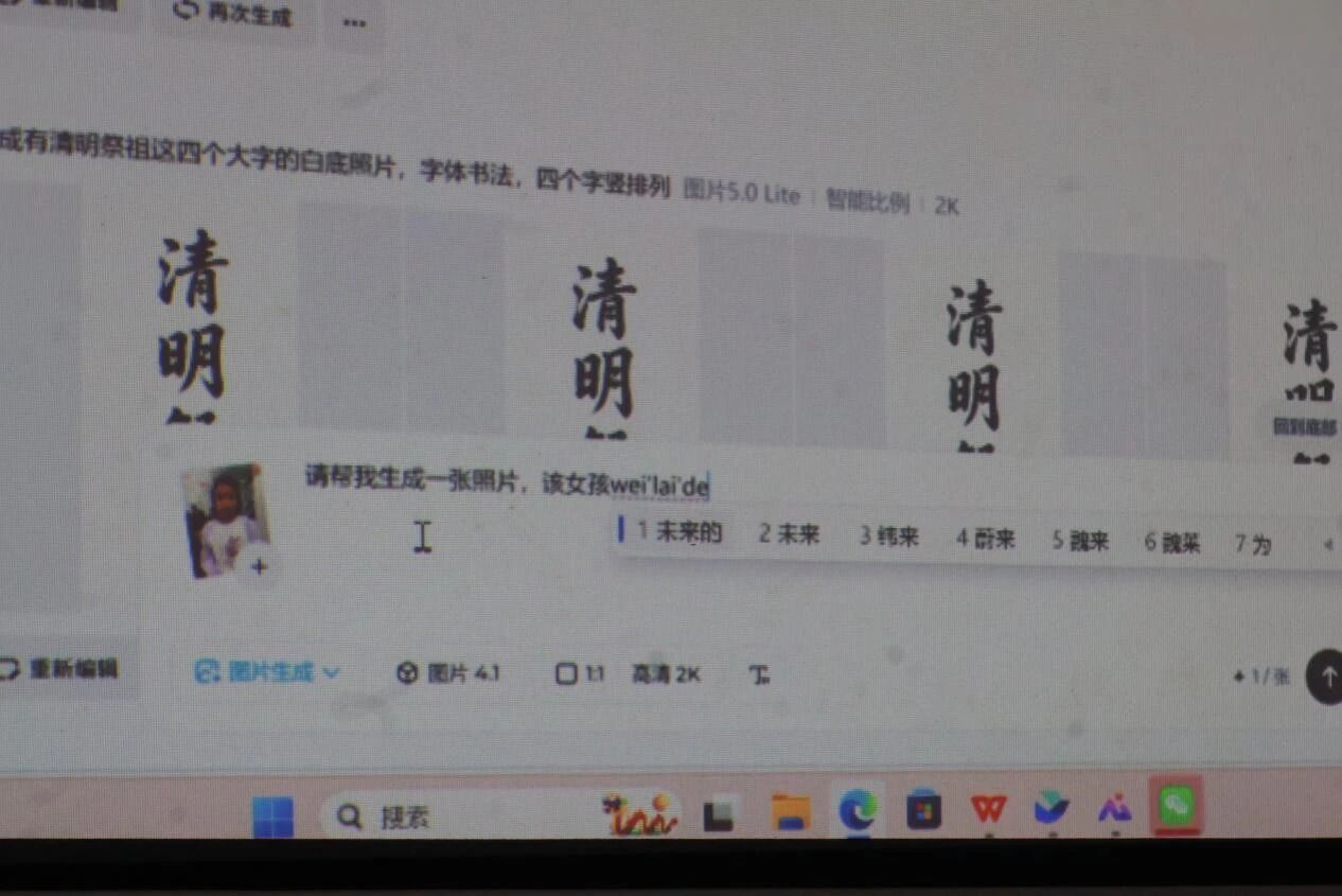 当传统非遗遇上现代科技,碰撞出别样的火花。本次活动特别设置AI 生成未来形象创新拓展环节,让孩子们将面塑的传统审美与科技创意相结合,大胆畅想未来。志愿者提前调试好 AI 绘图软件,连接投影设备,邀请小朋友自愿上台分享自己的梦想。“我想成为消防员,做会发光的面塑”“我想当医生,帮助更多的人”,孩子们用稚嫩的声音说出心中的憧憬,志愿者将孩子们的描述整理成关键词,现场上传生成专属的未来形象,大屏幕上的创意画面让孩子们惊喜不已。