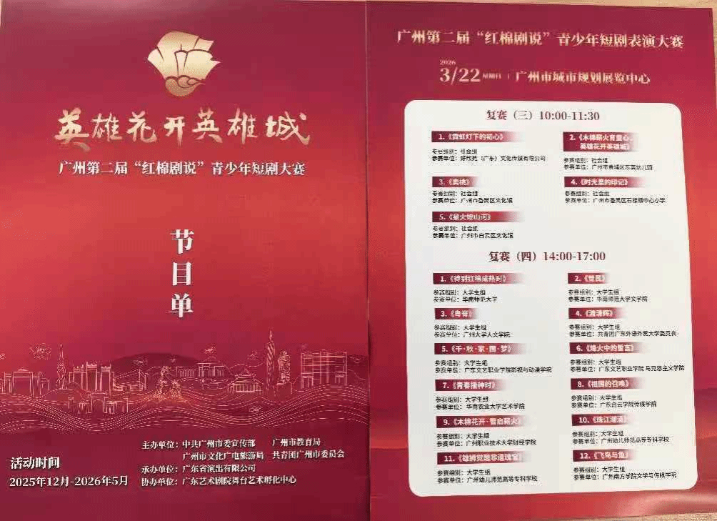 由中共广州市委宣传部、广州市教育局、广州市文化广电旅游局、共青团广州市委员会联合主办,广东省演出有限公司承办的广州“红棉剧说"青少年短剧大赛,自2025年启动首届赛事以来,吸引全市广大青少年广泛参与,通过"边赛边演边提升"的独特赛程模式,将优秀表演作品,搬进各爱国主义教育基地、国防教育基地、"英雄花开英雄城"红棉舞台等进行线下展演,成为一个融合思政美育实践、传承红色文化基因、培养戏剧新生力量的综合性平台。此次表演大赛共有33个作品入围,走进爱国主义教育基地、专业剧场"边赛边演"。