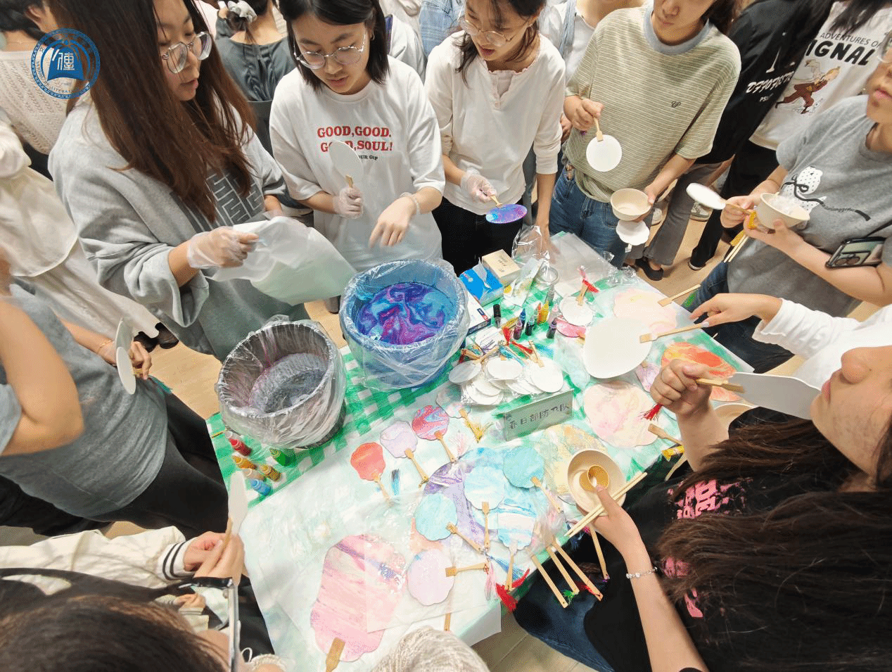 致辞结束后,非遗手作体验环节正式开启。本次活动设置了六大手作区:煎茶、青团、拓印、春饼、团扇、竹编,每区各有一支队伍参与,物料配备齐全。同学们可自由选择感兴趣的区域深入体验。煎茶区茶香氤氲,温壶、投茶、注水、出汤,步骤细致,韵味悠长;青团区里,揉面、包馅、塑形,大家制作出翠绿饱满的团子,感受春日清甜;拓印区中,同学们小心翼翼操作工具,将传统纹样清晰拓于纸上,成就感满满。春饼、团扇、竹编区也同样热闹,大家热情投入,在动手实践中体会非遗技艺的精妙。指尖翻飞间,一件件独具匠心的作品逐渐成型。现场暖意融融,热闹非凡。
