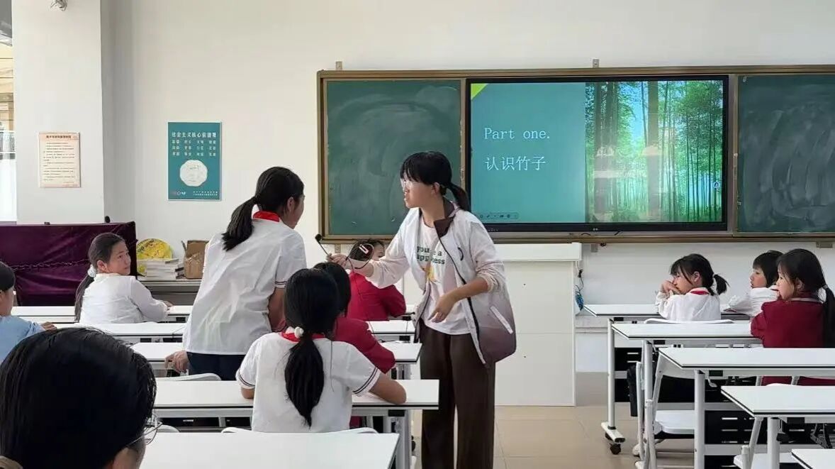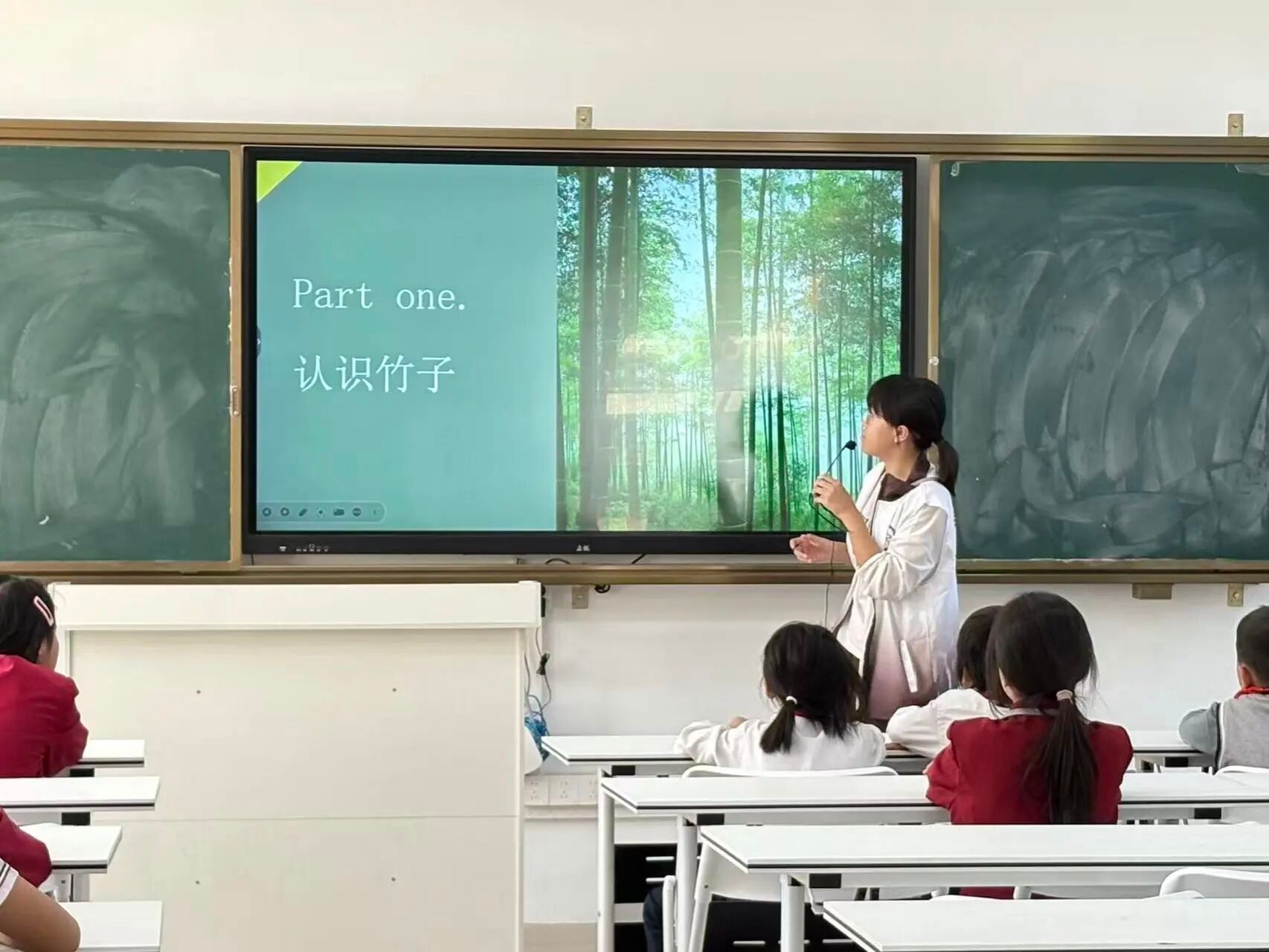 梁老师顺着这位同学的分享,笑着向孩子们展开介绍:竹子不仅是餐桌上的美味,更是生活里充满智慧的匠心载体。除了可食用的竹笋、竹筒饭,竹子还能用来建造房屋——傣族竹楼以竹为梁、以竹为墙,通风透气,是适应热带气候的智慧民居;桂林江上的竹排由粗壮竹杆捆扎而成,载着游人悠悠渡水,成为山水间的诗意风景;而精巧的竹编器物,更是在匠人指尖的挑压交织间,变成杯垫、扇面、竹篮等实用又美观的生活好物。