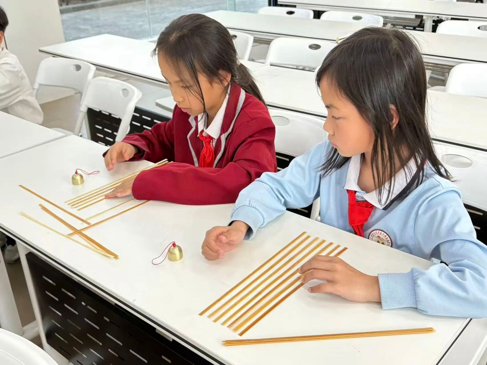 孩子们跟着屏幕上的步骤,先将竹条按“压一挑一”的方式交错编织,再把两边的竹条折叠扎起,指尖在柔韧的竹篾间穿梭,原本零散的竹条,渐渐变成了小巧精致的竹编小船风铃。