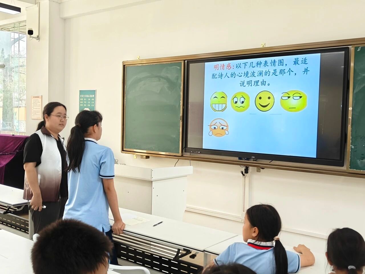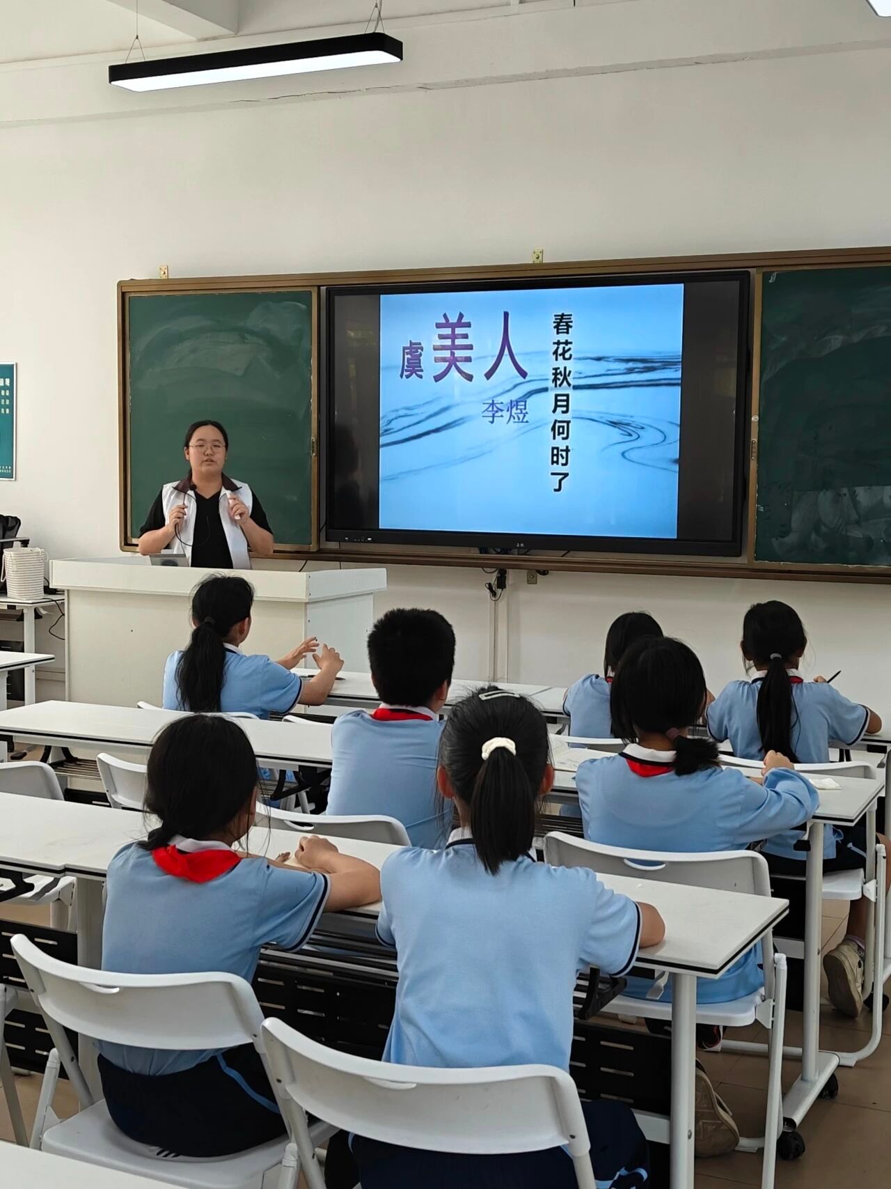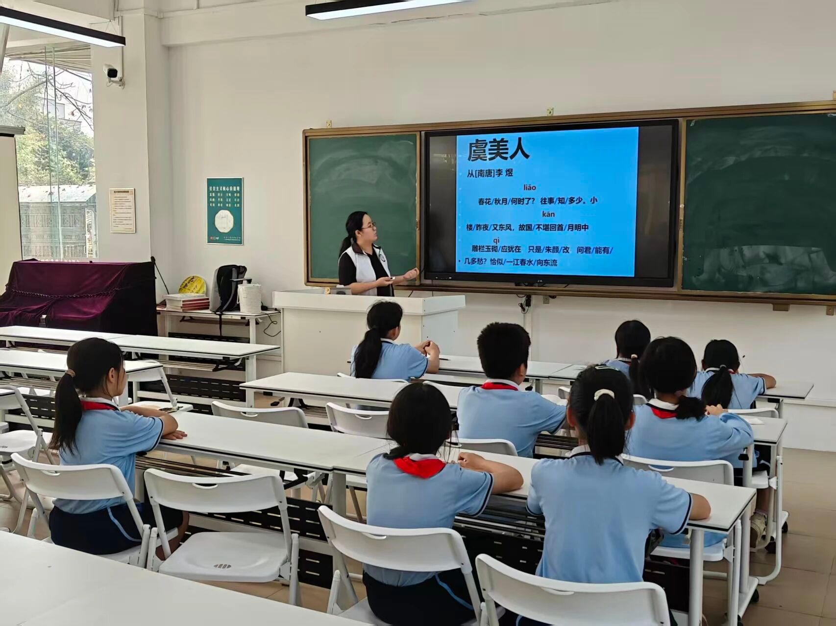 随后,小老师介绍了李煜的跌宕生平,从南唐国君到宋廷囚徒,身份的巨大落差,让同学们清楚地掌握了这首词的创作背景,为诗词赏析筑牢基础。诵读环节中,小老师标注重点字音,带领同学们逐句朗读,“春花秋月何时了?往事知多少……”朗朗读书声回荡在教室,同学们在反复诵读中,慢慢体悟诗词的韵律之美与深沉情感。