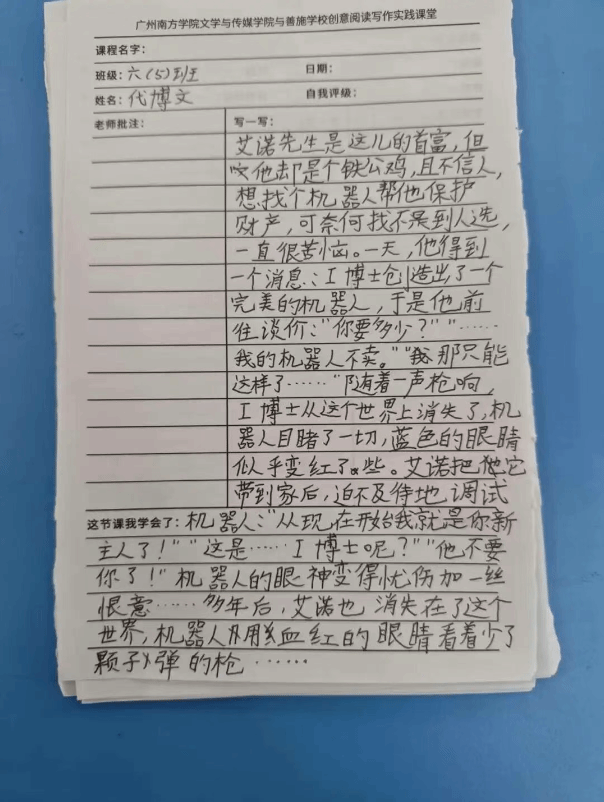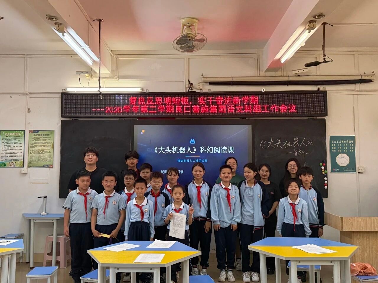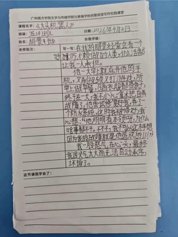 2026年4月2日,广州南方学院创意写作中心及语言文字服务团队在钟依琼老师的带领下走进善施学校,开展科幻创意阅读与写作课。本次课程由2024级新闻专业罗瑾慧同学主讲,以星新一《大头机器人》为载体,带领同学们探讨秘密与枷锁、科技与人性的关系。
