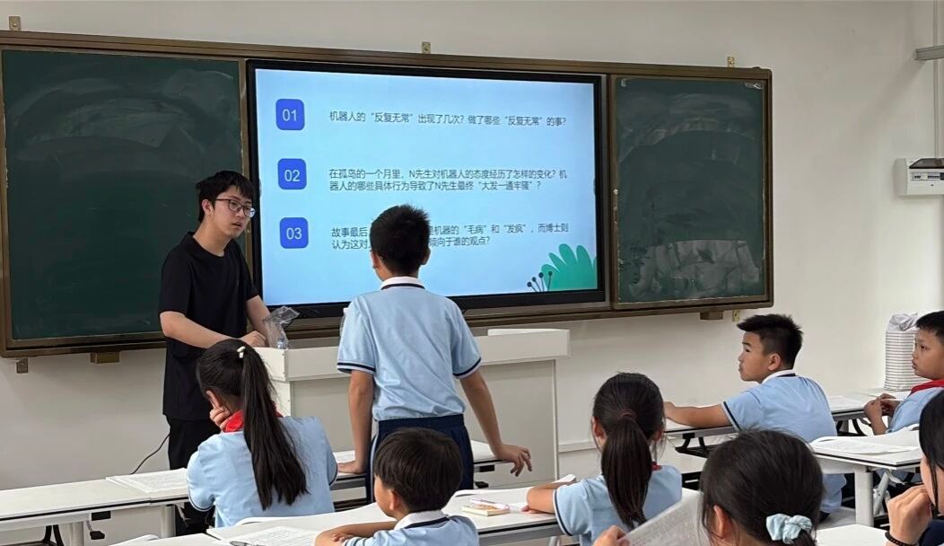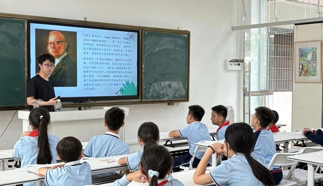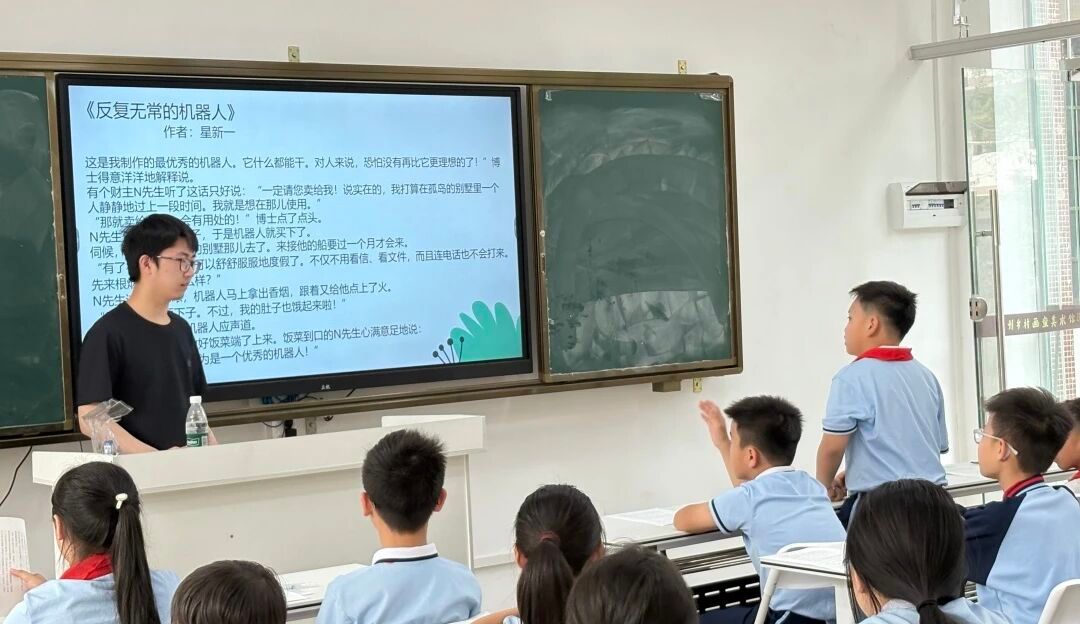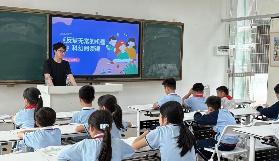 2026年3月26日,语言文字服务团队在刘涵玉老师的带领下走进善施学校,本次担任创意阅读与写作课堂小老师的是田思浩。本堂课,田老师以著名科幻作家星新一的《反复无常的机器人》为核心,带领同学们深入品读科幻小说的乐趣,启发了同学们的奇思幻想。