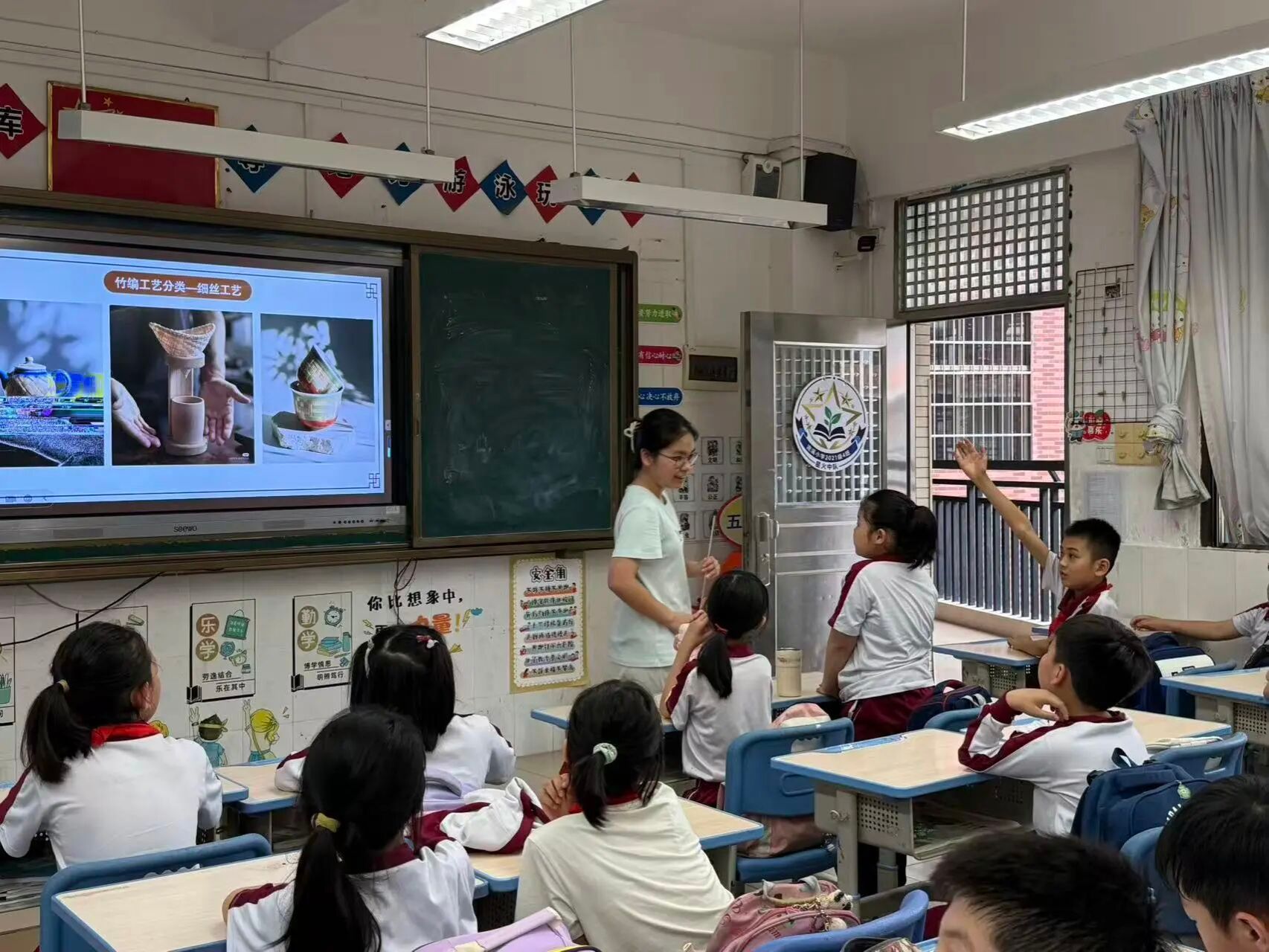 小卢老师将复杂的竹编工艺巧妙地分为两大类:粗犷有力的“粗丝工艺”和精致细腻的“细丝工艺”。她通过生动的对比,形象地讲解了粗丝和细丝在竹丝粗细、外观和用途上的显著差异。为了加深理解,她还展示了丰富的成品图片,从结实耐用的竹编果盘、屏风,到巧夺天工的瓷胎竹编花瓶、微型茶具,孩子们的眼睛里闪烁着惊叹的光芒,并踊跃分享自己更喜欢哪种工艺,课堂气氛十分热烈。