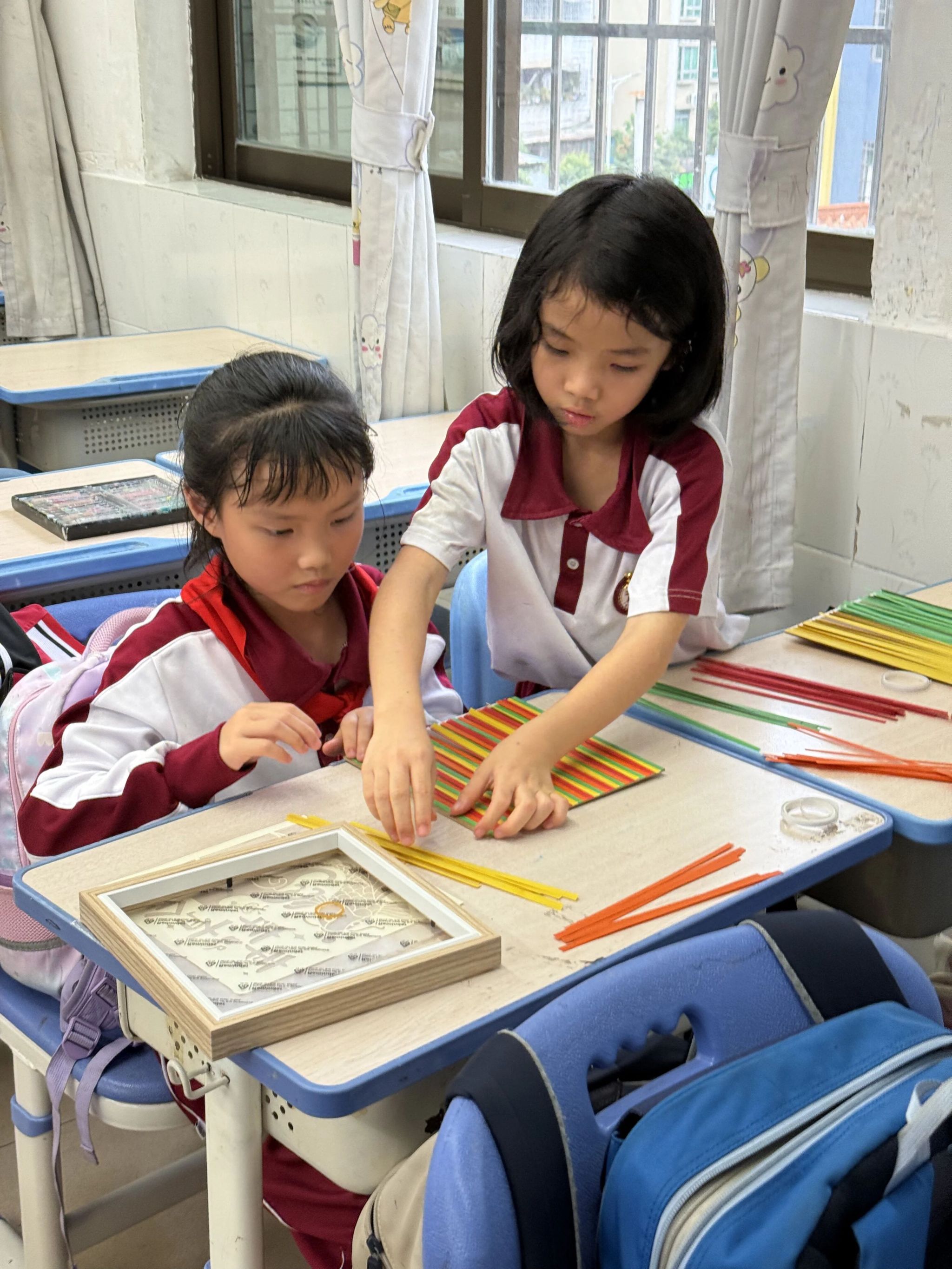 理论学习过后,最激动人心的手工制作环节开始了!孩子们拿到色彩缤纷的竹篾、相框、双面胶和模板卡纸,准备制作属于自己的竹编画。大家跟着小卢老师的步骤,先在相框底板上粘贴双面胶,然后将彩色竹篾按照自己的喜好整齐排列粘贴。接着,最关键的编织步骤来了,孩子们学习“挑一压一”的方法,将横向的竹篾交错编织进去,看着原本单调的底板渐渐呈现出精美的图案。遇到难题时,孩子们积极举手求助,小老师也耐心地一一指导。师生间的互动交流,不仅提高了孩子们的动手能力,更让整个课堂充满了欢声笑语。