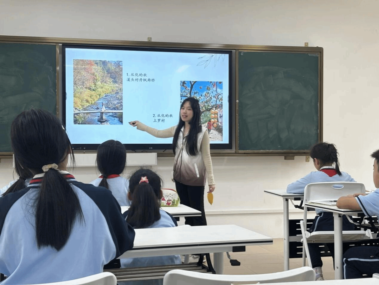 课程伊始,高雅文向每位学生分发金黄落叶作为写作素材,引导学生从颜色、纹理、气味等角度进行感官描述。有学生将树叶比作"香蕉的味道",生动展现了味觉与触觉的联动观察。在图片赏析环节,学生通过"流溪廊桥""柿园秋色"两幅本土景观图片,学习将听觉(溪水声)、视觉(枫叶如火)等感官体验转化为比喻与通感表达。