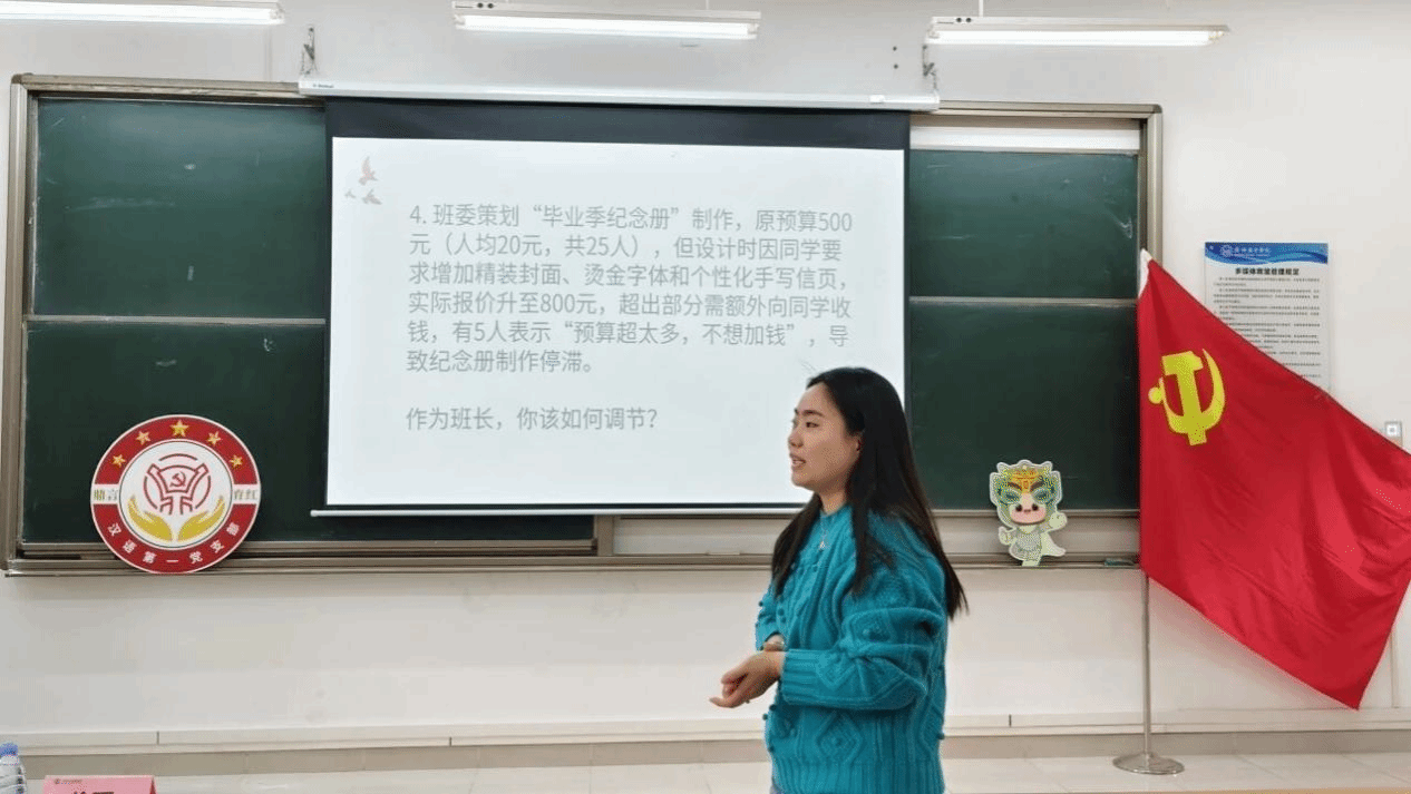 测试围绕班级管理中常见的矛盾与难题,设置情景模拟环节。各班班长面对“奖学金评定纠纷”“宿舍矛盾调解”“活动组织困境”“班级经费协调”等贴近生活的难题时积极思考、主动交流对策。当最后一道情景模拟题出现时,各学生骨干盯着黑黑板,不知从何下手。正当大家一筹莫展之际,徐硕老师结合自身教学经验与工作实际,起身为同学们答疑解惑,徐硕老师强调:“班长在班级中应充当起学生之间的‘调和剂’,在面对班级难以解决的问题时,各班干可以秉持着‘民主协调、换位思考、流程透明’的原则进行沟通协商”。