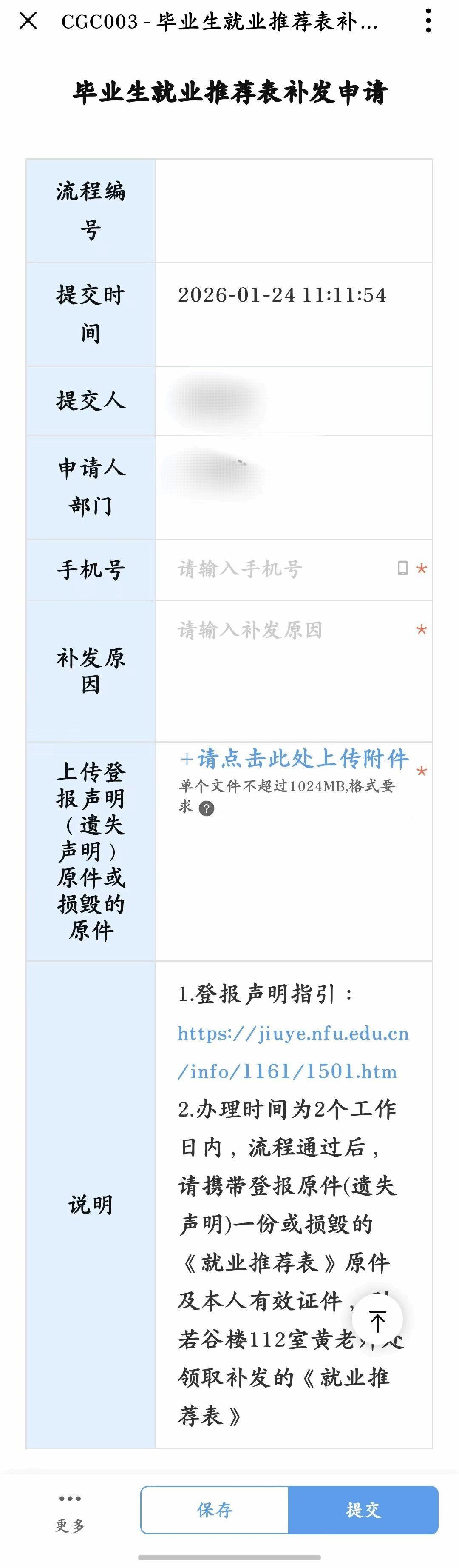 二、按系统提示分别填写:本人联系方式(手机号),申请补发原因,并上传“登报声明(遗失声明)原件的图片”或“损毁的就业推荐表原件的图片”等附件,进行提交;